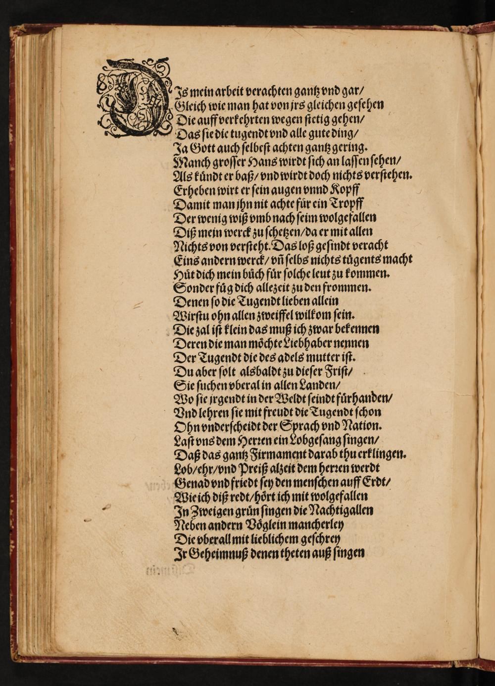 Diß mein werck zu ſchetzen/ da er mit allen Nichts von verſteht. Das loß geſindt veracht Eins andern werck/ vñ ſelbs nichts tuͤgents macht Hut dich mein buͤch fuͤr ſolche leut zu kommen. Sonder fuͤg dich allezeit zu den frommen. Denen ſo die Tugendt lieben allein