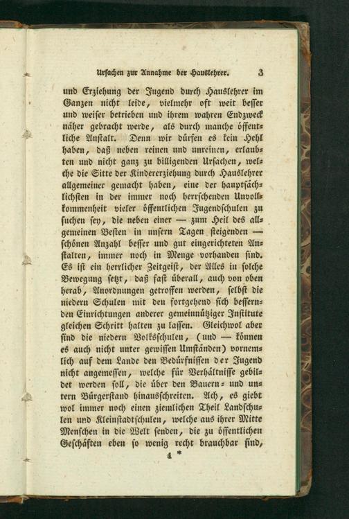 und Erziehung der Jugend durch Hauslehrer im Ganzen nicht leide, vielmehr oft weit beſſer und weiſer betrieben und ihrem wahren Endzweck naͤher gebracht werde, als durch manche oͤffent⸗ liche Anſtalt. Denn wir duͤrfen es kein Hehl haben, daß neben reinen und unreinen, erlaub⸗ ten und nicht ganz zu billigenden Urſachen, wel⸗ che die Sitte der Kindererziehung durch Hauslehrer allgemeiner gemacht haben, eine der hauptſaͤch⸗ lichſten in der immer noch herrſchenden Unvoll⸗ kommenheit vieler oͤffentlichen Jugendſchulen zu ſuchen ſey, die neben einer— zum Heil des all⸗ gemeinen Beſten in unſern Tagen ſteigenden— ſchoͤnen Anzahl beſſer und gut eingerichteten An⸗ ſtalten, immer noch in Menge vorhanden ſind. Es iſt ein herrlicher Zeitgeiſt, der Alles in ſolche Bewegung ſetzt, daß faſt uͤberall, auch von oben herab, Anordnungen getroffen werden, ſelbſt die niedern Schulen mit den fortgehend ſich beſſern⸗ den Einrichtungen anderer gemeinnuͤtziger Inſtitute gleichen Schritt halten zu laſſen. Gleichwol aber ſind die niedern Volksſchulen,(und— koͤnnen es auch nicht unter gewiſſen Umſtaͤnden) vornem⸗ lich auf dem Lande den Beduͤrfniſſen der Jugend nicht angemeſſen, welche fuͤr Verhaͤltniſſe gebil⸗ det werden ſoll, die uͤber den Bauern⸗ und un⸗ tern Buͤrgerſtand hinausſchreiten. Ach, es giebt wol immer noch einen ziemlichen Theil Landſchu⸗ len und Kleinſtadtſchulen, welche aus ihrer Mitte Menſchen in die Welt ſenden, die zu oͤffentlichen Geſchaͤften eben ſo wenig recht brauchbar ſind, 4 ½