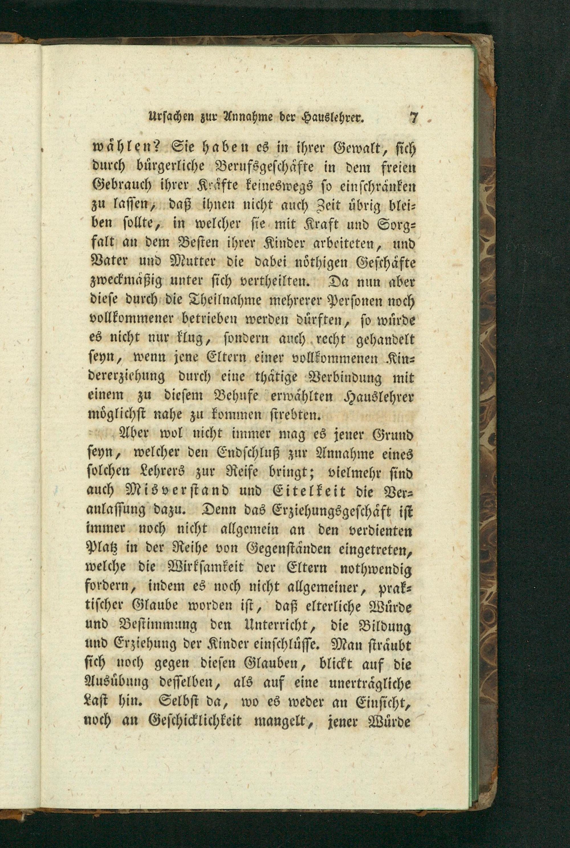 waͤhlen? Sie haben es in ihrer Gewalt, ſich durch buͤrgerliche Berufsgeſchaͤfte in dem freien Gebrauch ihrer Krafte keineswegs ſo einſchraͤnken zu laſſen, daß ihnen nicht auch Zeit uͤbrig blei⸗ ben ſollte, in welcher ſie mit Kraft und Sorg⸗ falt an dem Beſten ihrer Kinder arbeiteten, und Vater und Mutter die dabei noͤthigen Geſchaͤfte zweckmaͤßig unter ſich vertheilten. Da nun aber dieſe durch die Theilnahme mehrerer Perſonen noch vollkommener betrieben werden duͤrften, ſo wuͤrde es nicht nur klug, ſondern auch recht gehandelt ſeyn, wenn jene Eltern einer vollkommenen Kin⸗ dererziehung durch eine thaͤtige Verbindung mit einem zu dieſem Behufe erwäahlten Hauslehrer moͤglichſt nahe zu kommen ſtrebten.