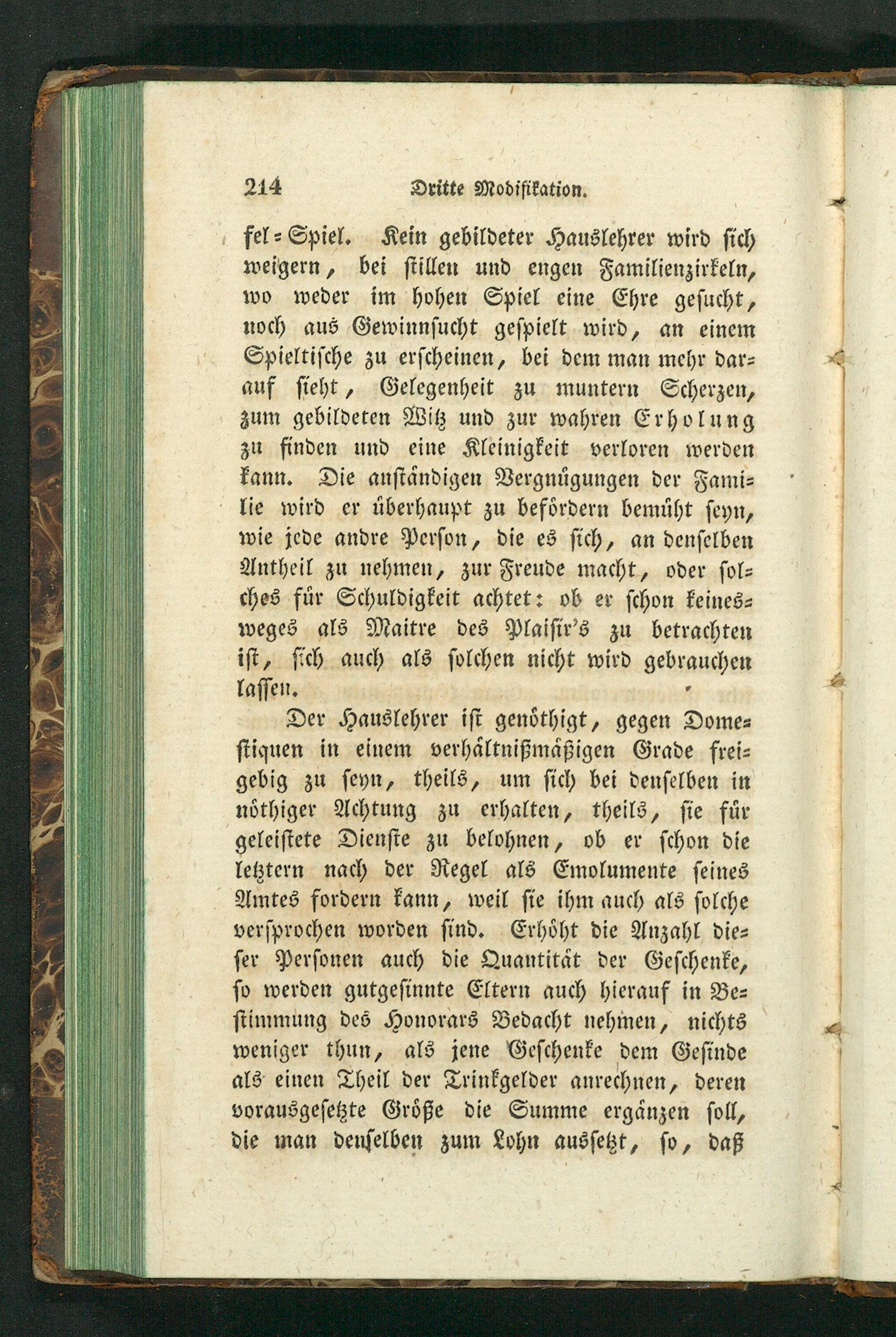 fel⸗Spiel. Kein gebildeter Hauslehrer wird ſich weigern, bei ſtillen und engen Familienzirkeln, wo weder im hohen Spiel eine Ehre geſucht, noch aus Gewinnſucht geſpielt wird, an einem Spieltiſche zu erſcheinen, bei dem man mehr dar⸗ auf ſieht, Gelegenheit zu muntern Scherzen, zum gebildeten Witz und zur wahren Erholung zu finden und eine Kleinigkeit verloren werden kann. Die anſtaͤndigen Vergnuͤgungen der Fami⸗ lie wird er uͤberhaupt zu befoͤrdern bemuͤht ſeyn, wie jede andre Perſon, die es ſich, an denſelben Antheil zu nehmen, zur Freude macht, oder ſol⸗ ches fuͤr Schuldigkeit achtet: ob er ſchon keines⸗ weges als Maitre des Plaiſir's zu betrachten iſt, ſich auch als ſolchen nicht wird gebrauchen laſſen..