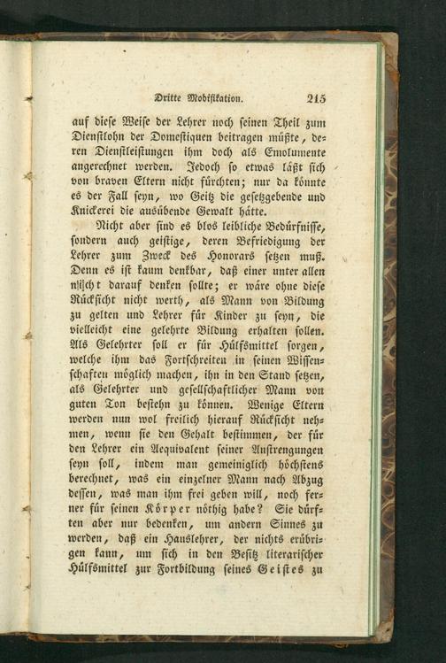 Nicht aber ſind es blos leibliche Beduͤrfniſſe, ſondern auch geiſtige, deren Befriedigung der Lehrer zum Zweck des Honorars ſetzen muß. Denn es iſt kaum denkbar, daß einer unter allen nſiſcht darauf denken ſollte; er waͤre ohne dieſe Ruͤckſicht nicht werth, als Mann von Bildung zu gelten und Lehrer fuͤr Kinder zu ſeyn, die vielleicht eine gelehrte Bildung erhalten ſollen. Als Gelehrter ſoll er fuͤr Huͤlfsmittel ſorgen, welche ihm das Fortſchreiten in ſeinen Wiſſen⸗ ſchaften moͤglich machen, ihn in den Stand ſetzen, als Gelehrter und geſellſchaftlicher Mann von guten Ton beſtehn zu koͤnnen. Wenige Eltern werden nun wol freilich hierauf Ruͤckſicht neh⸗ men, wenn ſie den Gehalt beſtimmen, der fuͤr den Lehrer ein Aequivalent ſeiner Anſtrengungen ſeyn ſoll, indem man gemeiniglich hoͤchſtens berechnet, was ein einzelner Mann nach Abzug deſſen, was man ihm frei geben will, noch fer⸗ ner fuͤr ſeinen Koͤrper noͤthig habe? Sie duͤrf⸗ ten aber nur bedenken, um andern Sinnes zu werden, daß ein Hauslehrer, der nichts eruͤbri⸗ gen kann, um ſich in den Beſitz literariſcher Huͤlfsmittel zur Fortbildung ſeines Geiſtes zu