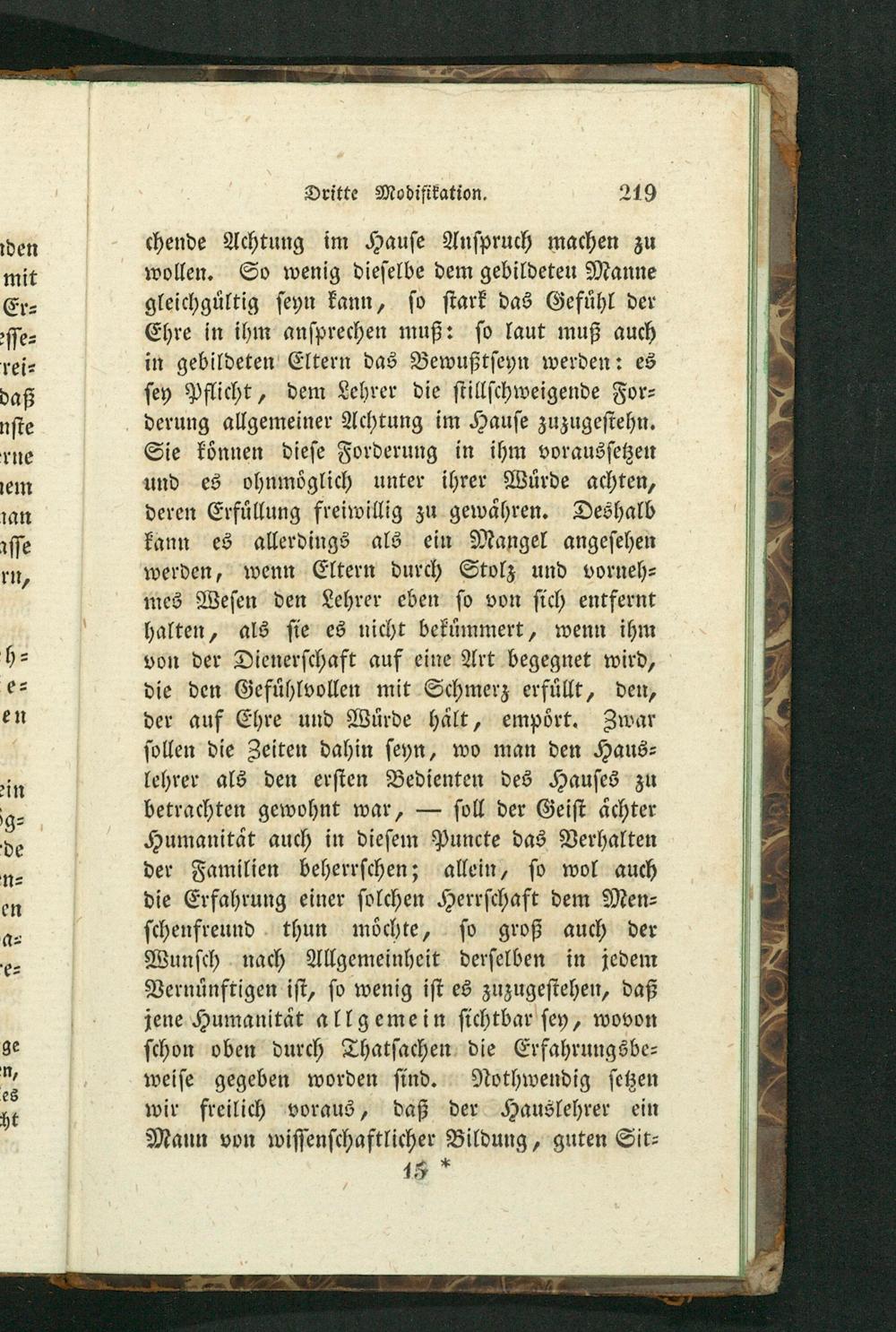 chende Achtung im Hauſe Anſpruch machen zu wollen. So wenig dieſelbe dem gebildeteu Manne gleichguͤltig ſeyn kann, ſo ſtark das Gefuͤhl der Ehre in ihm anſprechen muß: ſo laut muß auch in gebildeten Eltern das Bewußtſeyn werden: es ſey Pflicht, dem Lehrer die ſtillſchweigende For⸗ derung allgemeiner Achtung im Hauſe zuzugeſtehn. Sie koͤnnen dieſe Forderung in ihm vorausſetzen und es ohnmoͤglich unter ihrer Wuͤrde achten, deren Erfuͤllung freiwillig zu gewaͤhren. Deshalb kann es allerdings als ein Mangel angeſehen werden, wenn Eltern durch Stolz und vorneh⸗ mes Weſen den Lehrer eben ſo von ſich entfernt halten, als ſie es nicht bekuͤmmert, wenn ihm von der Dienerſchaft auf eine Art begegnet wird, die den Gefuͤhlvollen mit Schmerz erfuͤllt, den, der auf Ehre und Wuͤrde haͤlt, empoͤrt. Zwar ſollen die Zeiten dahin ſeyn, wo man den Haus⸗ lehrer als den erſten Bedienten des Hauſes zu betrachten gewohnt war,— ſoll der Geiſt aͤchter Humanitaͤt auch in dieſem Puncte das Verhalten der Familien beherrſchen; allein, ſo wol auch die Erfahrung einer ſolchen Herrſchaft dem Men⸗ ſchenfreund thun moͤchte, ſo groß auch der Wunſch nach Allgemeinheit derſelben in jedem Vernuͤnftigen iſt, ſo wenig iſt es zuzugeſtehen, daß jene Humanitaͤt allgemein ſichtbar ſey, wovon ſchon oben durch Thatſachen die Erfahrungsbe⸗ weiſe gegeben worden ſind. Nothwendig ſetzen wir freilich voraus, daß der Hauslehrer ein Mann von wiſſenſchaftlicher Bildung, guten Sit⸗