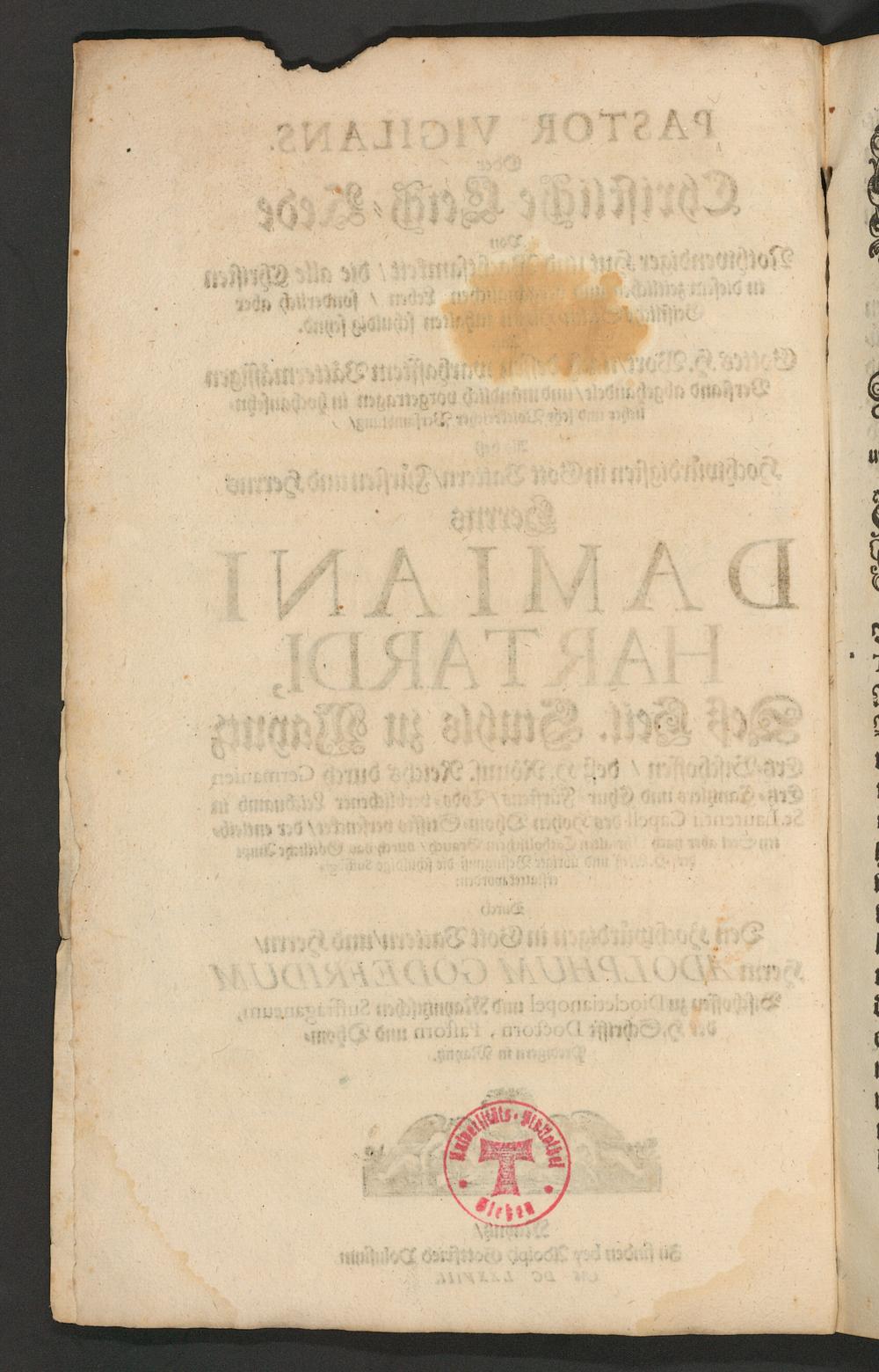 Pastor Vigilans. Oder Christliche Leich-Rede Von Nothwendiger Hut und Wachtsamkeit/ die alle Christen in diesem zeitlichen und vergänglichen Leben/ sonderlich aber Geistliche Seelen-Hirten zuhalten schuldig seynd : Auß Gottes H. Wort/ nach dessen wahrhafftem Vättermässigen Verstand abgehandelt/ und mündlich vorgetragen in hochansehnlicher und sehr Volckreicher Versamblung/ Als deß Hochwürdigsten in Gott Vattern/ Fürsten und Herrns Herrns Damiani Hartardi, Deß Heil. Stuhls zu Mayntz Ertz-Bischoffen/ deß H. Römis. Reichs durch Germanien Ertz-Cantzlers und Chur-Fürstens/ Tods-verblichener Leichnamb in St. Laurentii Capell des Hohen Dhom-Stiffts versencket/ der entleibten Seel aber nach Uhr-alten Catholischem Brauch/ durch das Göttliche Ampt der H. Mess. und übriger Besingnuß die schuldige Suffragia erstattet worden / Durch den Hochwürdigen in Gott Vattern/ und Herrn/ Herrn Adolphum Godefridum, Bischoffen zu Diocletianopel und Mayntzischen Suffraganeum, der H. Schrifft Doctorn, Pastorn und Dhom-Predigern in Mayntz