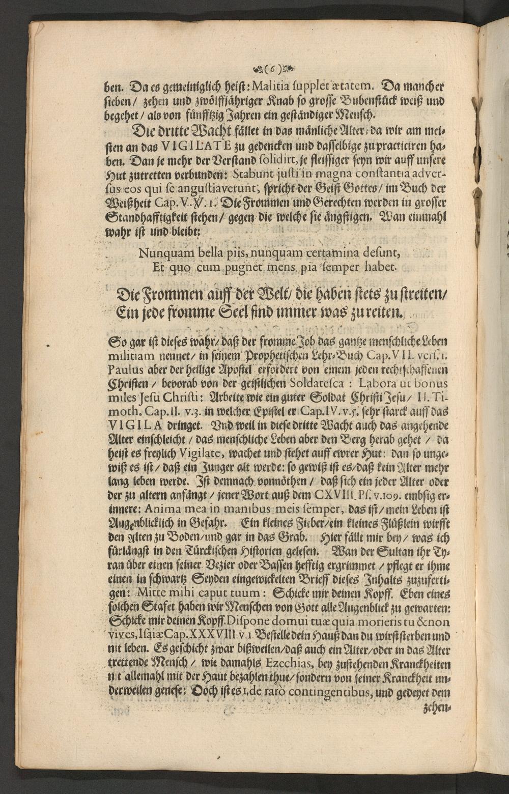 ε6)„ ben. Da es gemeiniglich heiſt: Malitia ſupplet ætatem. Da mancher ſieben/ zehen und zwoͤlffjaͤhriger Knab ſo groſſe Bubenſtuͤck weiß und begehet/ als von fuͤnfftzig Jahren ein geſtaͤndiger Menſch. Die dritte Wacht faͤllet in das maͤnliche Alter, da wir am mei⸗ ſten an das VIGILATE zu gedencken und daſſelbige zu practieiren ha⸗ ben. Dan je mehr der Verſtand ſolidirt, je fleiſſiger ſeyn wir auff unſere Hut zutretten verbunden: Stabunt juſti in magna conſtantia adver- ſus eos qui ſe anguſtiaverunt; ſpricht der Geiſt Gottes/ im Buch der Weißheit Cap. V. V. 1. Die Frommen und Gerechten werden in groſſer wahr iſt und blebtt Nunquam bella piis, nunquam certamina deſunt, Et quo cum pugnet mens pia ſemper haber.