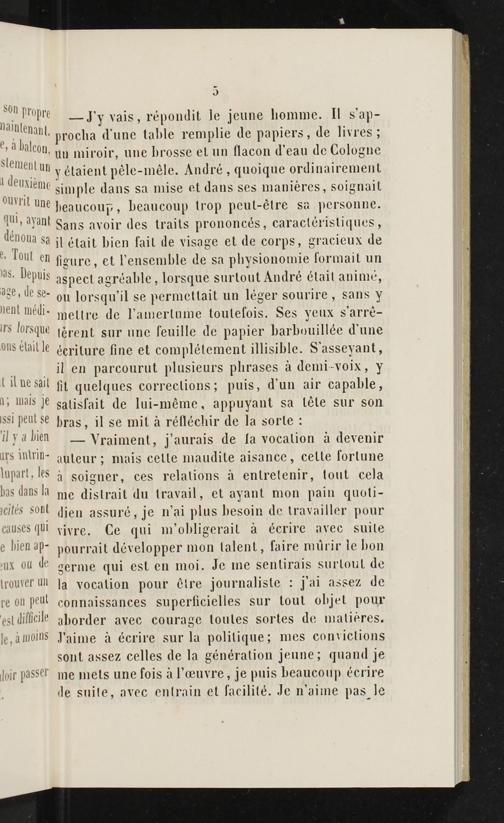 1— Py vais; répondit Je jeune homme. Il sap- . lalcon procha 4 une table remplie de papiers, de livres; 3 un miroir, une Drosse et un flacon d'eau de Cologne lemen un y étaient péle-méle. André, quoique ordinairement Kdemüme simple dans sa mise et dans ses manières, soignait vurrit une heaucoup, beaucoup trop peut-ètre sa personne. Qul, ayant Sans avoir des traits prononcés, caractéristiques, dénona sa jl était bien fait de visage et de corps, gracieux de e Taut en ſigure, et'ensemble de sa physionomie formait un us. Depuis aspect agréable, lorsque surtout André était animé, age. de se- ou lorsqu'il se permettait un léger sourire, sans y dent méäli- mettre de l'amertume toutefois. Ses yeux Sarréè- irs lorsque lérent sur une feuille de papier barbouillée d'une ons éüille gcriture ſine et complétement illisible. S'asseyant, il en parcourut plusieurs phrases à demi-voix, y Gil ne sät ſit quelques corrections; puis, d'un air capable, à; mäls je salisfait de lui-méême, appuyant sa tète sur son Ssi peut se pras, il se mit à réſléchir de la sorte: ilra hien— Vraiment, j'aurais de la vocalion à devenir urs intrin- auteur; mais cette maudite aisance, cette fortune lupart, les à soigner, ces relations à entretenir, tout cela bas dans la me distrait du travail, et ayant mon pain quoti- zciles sont dien assuré, je n'ai plus besoin de travailler pour causes qui vivre. Ce qui m'obligerait à écrire avec suite e bien ap- pourrait développer mon talent, faire murir le bon ux ou de germe qui est en moi. Je me sentirais surtout de troufer un la vocation pour être journaliste: j'ai assez de re on peut connaissances superſficielles sur tout objet pour esl difcile aborder avec courage toutes sortes de matiéres. le,àmoins yaime à écrire sur la politique; mes conrictions sont assez celles de la génération jeune; quand je Voir passer me mets une fois à l'œuvre, je puis beaucoup écrire de suite, avec entrain et facilité. Je n'aime pas le