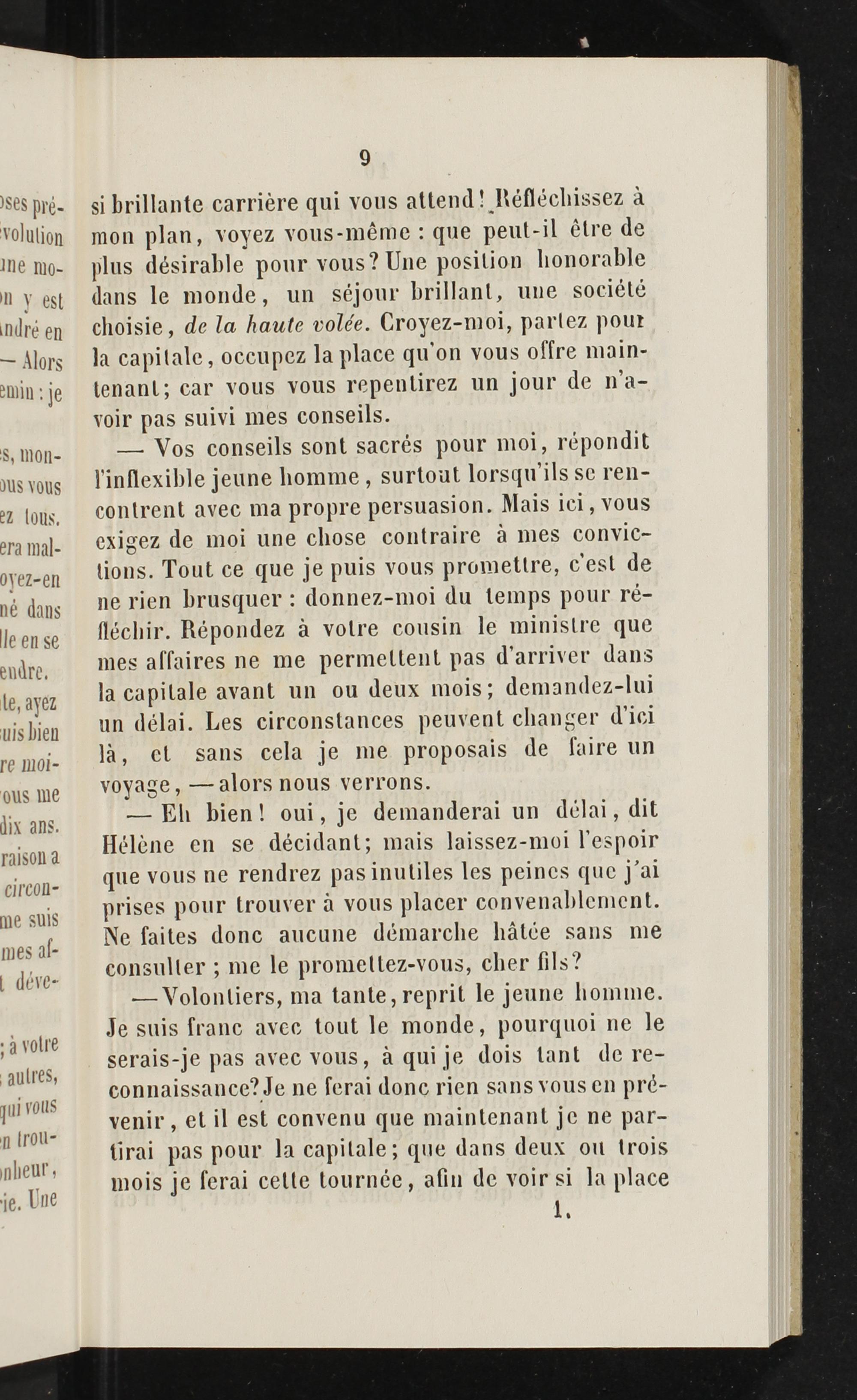 si brillante carrière qui vous attend! Réfléchissez à mon plan, voyez vous-mèême: que peutril étre de plus désirable pour vous? Une position honorable dans le monde, un séjour brillant, une société choisie, de la haute volée. Croyez-moi, partez pour la capitale, occupez la place qu'on vous offre main- lenant; car vous vous repentirez un jour de m'a- voir pas suivi mes conseils.