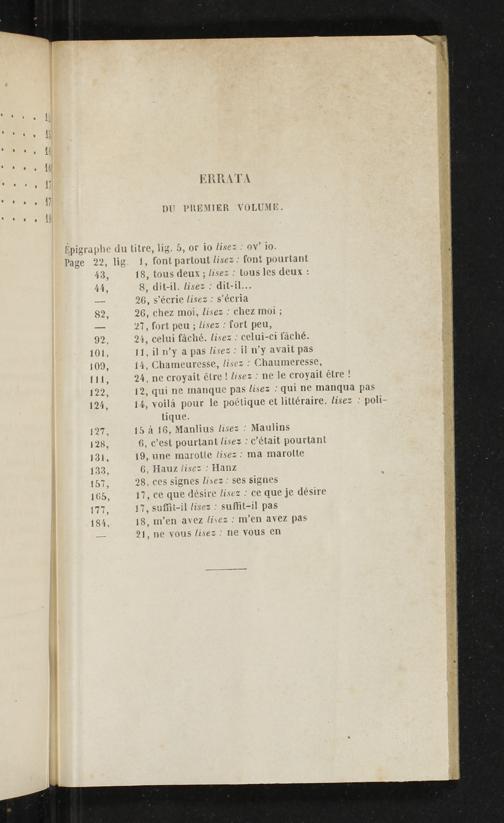 26, s'écrie lisez: s'écria 26, chez moi, lisez: chez moi; 27, fort peu; lisez: fort peu, 24, celui fàché. lisez- celui-ci fàché. 11, il n'y a pas lisez: il n'T avait pas 14, Chameuresse, lisez: Chaumeresse, 24, ne croyait étre! lisez: ne le croyait étre! 12, qui ne manque pas lisez: qui ne manqua pas 14, voilà pour le poétique et littéraire, lisez: poli-
