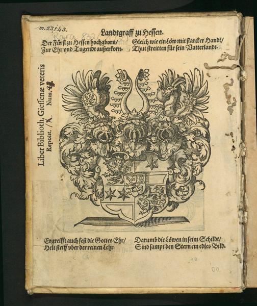 3 Landtgraff zu Heſſen.„ Der Fuͤrſt zu Heſſen hochgborn/ Gleich wie ein Loͤw mit ſtarcker Handl/ Zur Ehr vnd Tugendt außerkorn · Thut ſtreitten fuͤr ſein Vatterlandt ·.