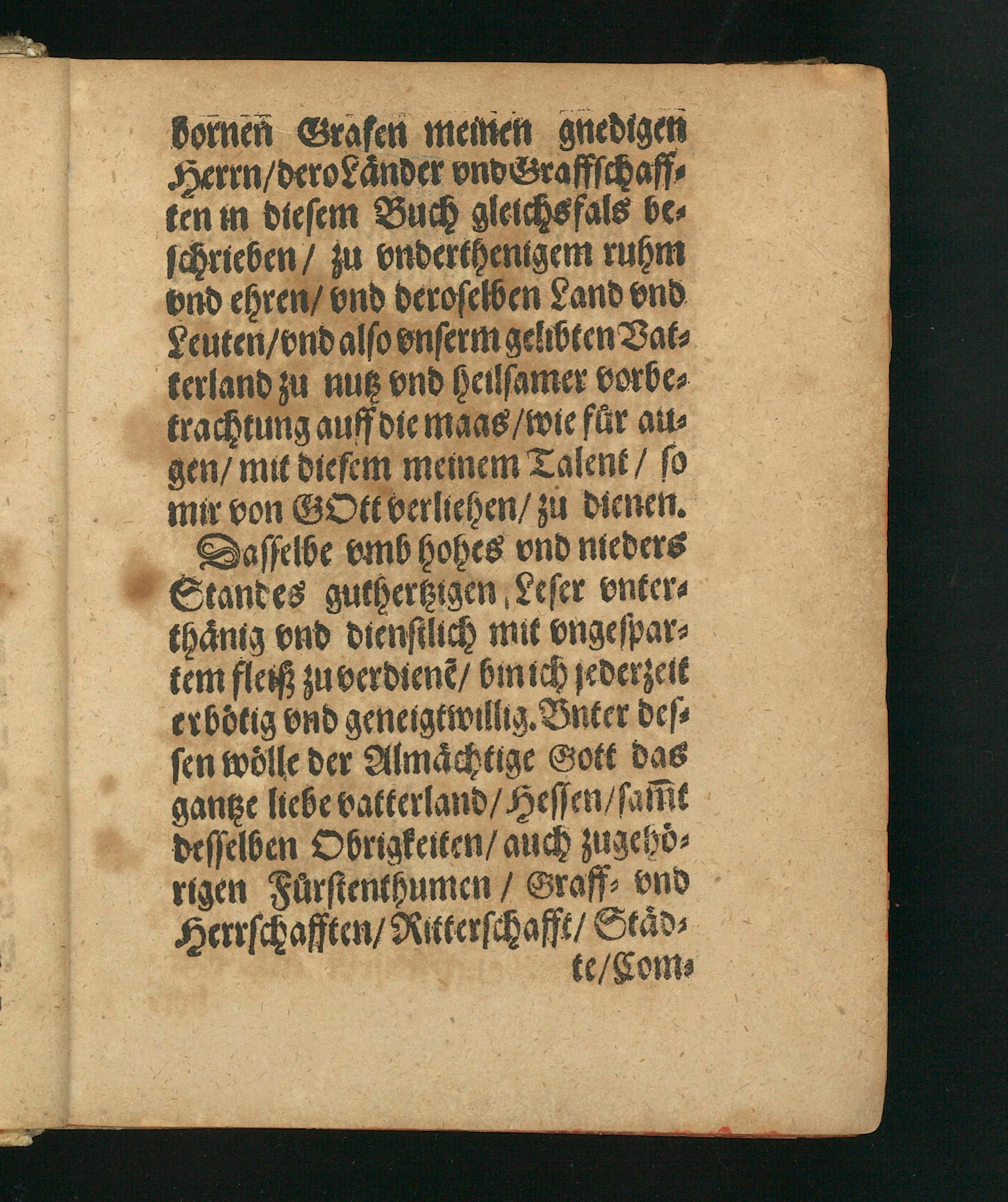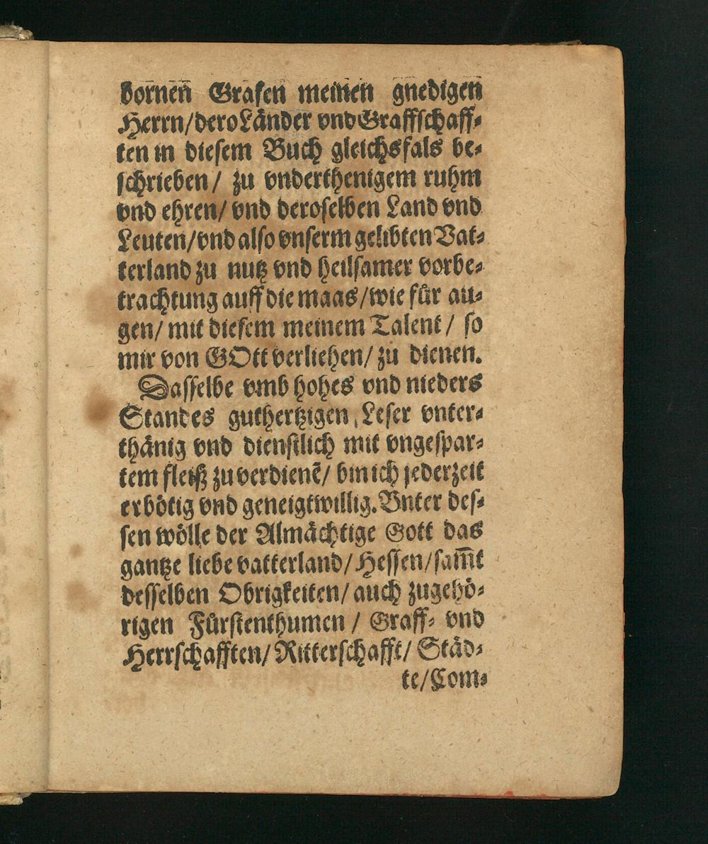bornen Grafen meinen gnedigen Herrn/ deroLaͤnder vnd Graffſchaff⸗ ten in dieſem Buch gleichsfals be⸗ ſchrieben/ zu onderthenigem ruhm vnd ehren/ vnd deroſelben Land vnd Leuten/ vnd alſo onſerm gelibten Vat⸗ terland zu nutz vnd heilſamer vorbe⸗ trachtung auff die maas/ wie fuͤr au⸗ gen/ mit dieſem memem Talent/ ſo mir von GOtt verliehen/ zu dienen. Daſſelbe vmb hohes vnd nieders Standes guthertzigen Leſer onter⸗ thaͤnig ond dienſtlich mit ongeſpar⸗ tem fleiß zu verdienẽ/ bmich jederzelt erbotig vnd geneigtwillig. Bnter deſ⸗ ſen woͤlle der Almaͤchtige Gott das gantze liebe vatterland/ Heſſen/ ſaffit deſſelben Obrigkeiten/ auch zugeho⸗ rigen Fuͤrſtenthumen/ Graff⸗ vnd Herrſchafften/ Ritterſchafft/ Staͤd⸗ te/ Com⸗