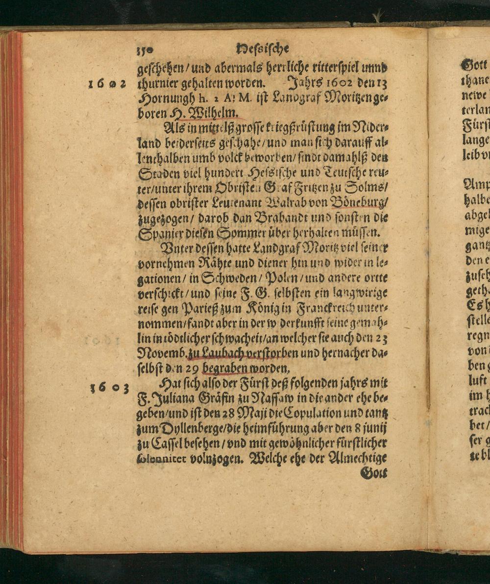 zugezogen/ darob dan Brabandt und ſonſten die Spanfr dieſen Sommer uͤber herhalren muͤſſen. Buter deſſen hatte Landgraf Moritz viel ſeiner vornehmen Raͤhte und diener hin und wider in le⸗ gationen/ in Schweden/ Polen/ und andere ortte verſchickt/ und ſeine F. G. ſelbſten ein langwirtge reiſe gen Parieß zum Koͤnig in Franckreich unter⸗ nommen/ fandt aber in der w derkunfft ſeine gemah⸗ lin in ꝛoͤdtlicher ſchwacheit/ an welcher ſie auch den 23 Novemb. zu Laubach verſtorben und hernacher da⸗ ſelbſt den 29 begraben worden. Hat ſich alſo der Fuͤrſt deß folgenden jahrs mit F. Juliana Graͤfin zu Naſſaw in die ander ehe be⸗