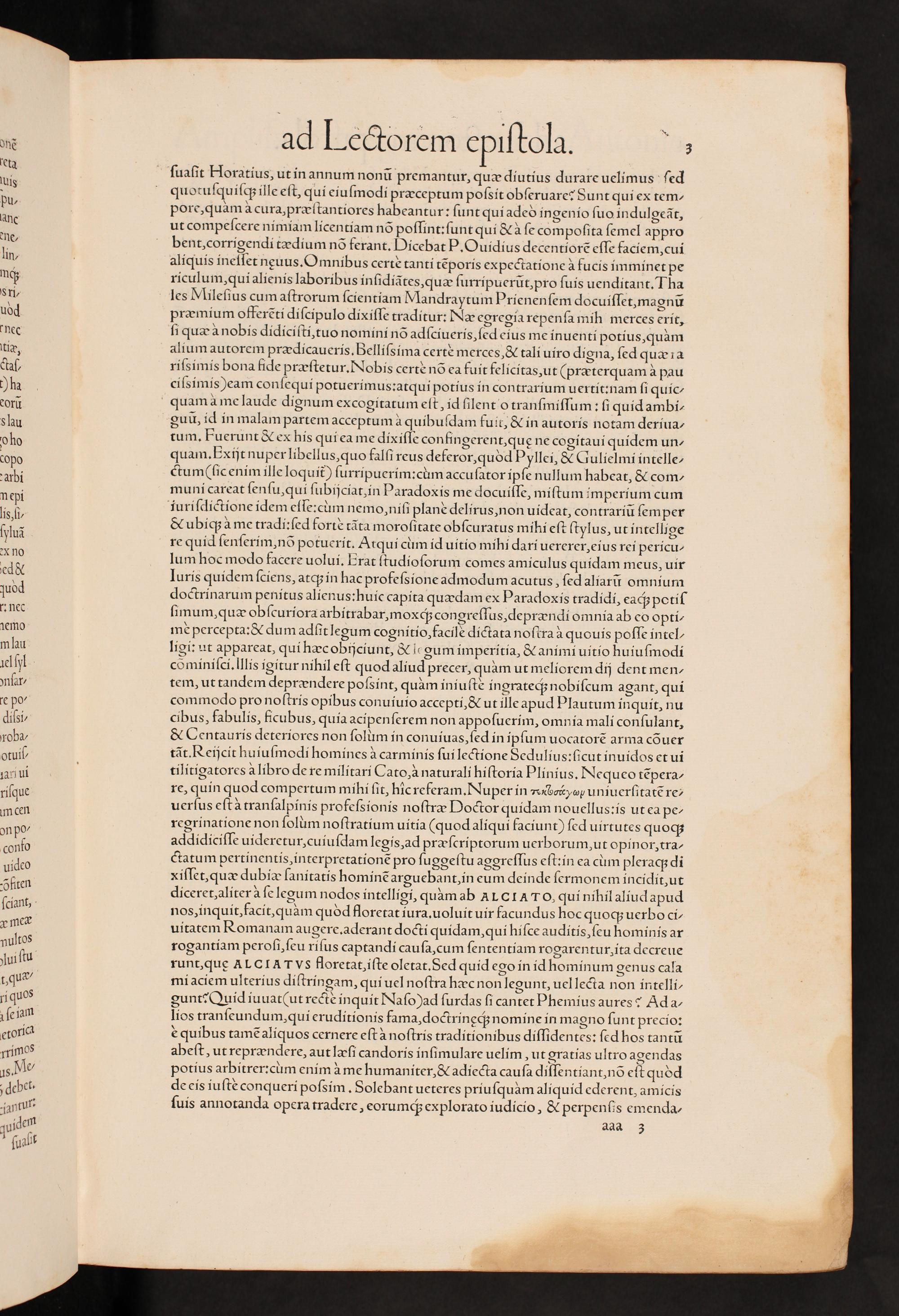 guũ, id in malam partem acceptum à quihuſdam fuit,& in autoris notam deriua- tum. Fuerunt& ex his qui ea me dixiſſe confingerent, quę ne cogitaui quidem un- quam. BExijt nuper libellus, quo falſi reus deferor, quòd Pyllei,& Gulielmi intelle- ctum(ſic enim ille loquit᷑) ſurripuerim: cùm accuſator ipſe nullum habeat,& com- muni careat ſenſu, qui ſubijciat, in Paradoxis me docuiſſe, miſtum imperium cum iuriſdictione idem eſſe: cum nemo, niſi planè delirus, non uideat, contrariũ ſemper ubiq; à me tradi:ſed fortè tãta moroſitate obſcuratus mihi eſt ſtylus, ut intellige re quid ſenſerim, nõ potuerit. Atqui cuim id uitio mihi dari uererer, eius rei pericu- lum hoc modo facere uolui. Brat ſtudioſorum comes amiculus quidam meus, uir Iuris quidem ſciens, atq; in hac profeſsione admodum acutus, ſed aliarũ omnium doctrinarum penitus alienus:huic capita quædam ex Paradoxis tradidi, eaq; potiſ ſimum, quæ obſcuriora arbitrabar, moxq́; congreſſus, deprændi omnia ab eo opti/ mè percepta:& dum adſit legum cognitio, facilè dictata noſtraà quouis poſſe intel/ ligi: ut appareat, qui hæc obijciunt,& legum imperitia,& animi uitio huiuſmodi cõôminiſci.Illis igitur nihil eſt quod aliud precer, quàm ut meliorem dij dent men/ tem, ut tandem deprændere poſsint, quàm iniuſtè ingrateq́; nobiſcum agant, qui commodo pro noſtris opibus conuiuio accepti,& ut ille apud Plautum inquit, nu cibus, fabulis, ficubus, quia acipenſerem non appoſuerim, omnia mali conſulant, & Centauris deteriores non ſolum in conuiuas, ſed in ipſum uocatorẽ arma cõuer tãt. Reijcit huiuſmodi homines à carminis ſui lectione Sedulius: ſcut inuidos et ui tilitigatores à libro de re militari Cato, à naturali hiſtoria Plinius. Nequeo tẽpera-/ re, quin quod compertum mihi ſit, hic referam. Nuper in ⸗πνιον uniuerſitaté re- uerſus eſt àtranſalpinis profeſsionis noſtræ Doctor quidam nouellus: is ut ea pe- regrinatione non ſolum noſtratium uitia(quod aliqui faciunt) ſed uirtutes quoq; addidiciſſe uideretur, cuiuſdam legis, ad præſcriptorum uerborum, ut opinor, tra- ctatum pertinentis, interpretationẽè pro ſuggeſtu aggreſſus eſt: in ea cum pleraq; di xiſſet, quæ dubiæ ſanitatis hominẽ arguebant, in eum deinde ſermonem incidit, ut diceret, aliter à ſe legum nodos intelligi, quàm ab ALCIA ToO, qui nihil aliud apud nos, inquit, facit, quàm quòd floretat iura. uoluit uir facundus hoc quoq; uerbo ci/ uitatem Romanam augere. aderant docti quidam, qui hiſce auditis, ſeu hominis ar rogantiam peroſi, ſeu riſus captandi cauſa, cum ſententiam rogarentur- ita decreue runt, quę ALCIAT vs floretat, iſte oletat. Sed quid ego in id hominum genus cala mi aciem ulterius diſtringam, qui uel noſtra hæc non legunt, uellecta non intelli- gunt:? Quid iuuat ut rectè inquit Naſo)ad ſurdas ſi cantet Phemius aures? Ada- lios tranſeundum, qui eruditionis fama, doctrinęcq; nomine in magno ſunt precio: quibus tamẽ aliquos cernere eſt à noſtris traditionibus diſſidentes: ſed hos tantũ abeſt, ut reprændere, aut læſi candoris inſimulare uelim„ut gratias ultro agendas potius arbitrer:cum enim à me humaniter,& adiecta cauſa diſſentiant, nõ eſt quòd de eis iuſtè conqueri poſsim. Solebant ueteres priuſquàm aliquid ederent, amicis ſuis annotanda opera tradere, eorumq; explorato iudicio,& perpenſis emenda-