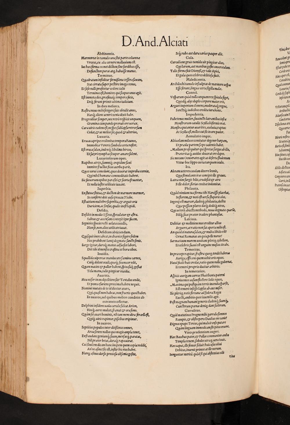 Abſtinentia. Marmoreæ in tumulis unaſtat parte columnæ Vrceus, ex alia cernere malluuium eſt. lus hæc forma monet dictum ſine ſordibus eſſe, Defuncuum puras atq; habuiſſe manus. Terminus. Quadratum infditur firmißima teſſera ſaxum, Stat cirrata ſuper pectore imago tenus, Et ſeſe nulli profitetur cedere.talis Terminus eſt, homines qui ſcopus unus agit. Eſt immota dies, præfixaq́; tempora fatis, Deq; ferunt primis ultima iudicium. In dies meliora. Roſtra nouo mihi ſetigeri ſuis obtulit anno, Hæcq́; cliens uentri xenia dixit habe. Progreditur ſemper, nec retrò reſpicit unquam, Gramina cùm pando proruit ore uorax. Cura uiris eadem eſt, ne ſpes ſublapſa retrorſum Cedat,& ut melius ſit, quod& ulterius, Luxuria. Eruca capripes redimitus tempora Faunus, Immodicæ Veneris ſmbola certa refert. Eſt eruca ſalax, indexq́; libidinis hircus, Et ſatyri wmphas ſemper amare ſolent. Luxurioſorum opes. Rubpibus acrijs, ſummiq́; crepidine ſaxi Immites fructus ficus acerba parit, Quos corui comedunt, quos deuorat improba cornix, Qui nihil humanæ commoditatis habent. Sic fatuorum opibus paraſiti& ſcorta fruuntur, Et nulla iuſtos utilitate iuuant. Superbia. En ſtatuæ ſtatua,& ductum de marmore marmor, ge conferre deis auſa procax Niobe. Eſt uitium muliebre ſuperbia,& arguit oris Duriciem, ac ſenſus, qualis ineſt lapidi. Deſidia. Deſidet in modio Eſſæus, ſpeculatur& aſtra. Subtus& accenſam contegit igne facem. Segnities ſpecie recti uelata cucullo, Non ſe, non alios utilitate iuuat. Deſidiam abijciendam. Quiſquis iners abeat, in chœnice figere ſedem Nos prohibent Samij dogmata ſancta ſenis. Surge igitur, duroq́; manus ad ſueſce labori, Det tibi dimenſos craſina ut hora cibos. Inuidia. Squallida uipereas manducans fœmina carner, Cuiq;ʒ dolent oculi, quæq́; ſuum cor edit, Quam macies& pallor habent, ſpinoſaq; geſtat Tela manu, talis pingitur inuidia. Auaritia. Heu miſer in medijs ſitiensſtat Tantalus undis, Et poma eſuriens proxima habere nequit. Nomine mutato de te id dicetur auare, Qui, quaſi non habeas, non frueris quod habet. In auaros, uel quibus melior conditio ab extraneis offertur. Delphini inſidens uada cærula ſulcat Arion, Hocq; aures mulcest, frænat& ora ſono. Quam ſit auari hominis, nõ tam mens dira ferarii eſt. Quiq; uiris rapimur, piſcibus eripimur. In auaros. Septitius populos inter ditißimus omnes, Arua ſenex nullus quo magis ampla tenet, Defraudans geniumq; ſuum, menſasq́; paratas, Nil præter betas, duraq́ rapauorat. Cui ſimilem dicam hunc inopem quem copia reddit, An ne aſinorſic eſt, inſtar hic eius habet.— Nanq; aſinus dorſo precioſa obſonia geſtat,