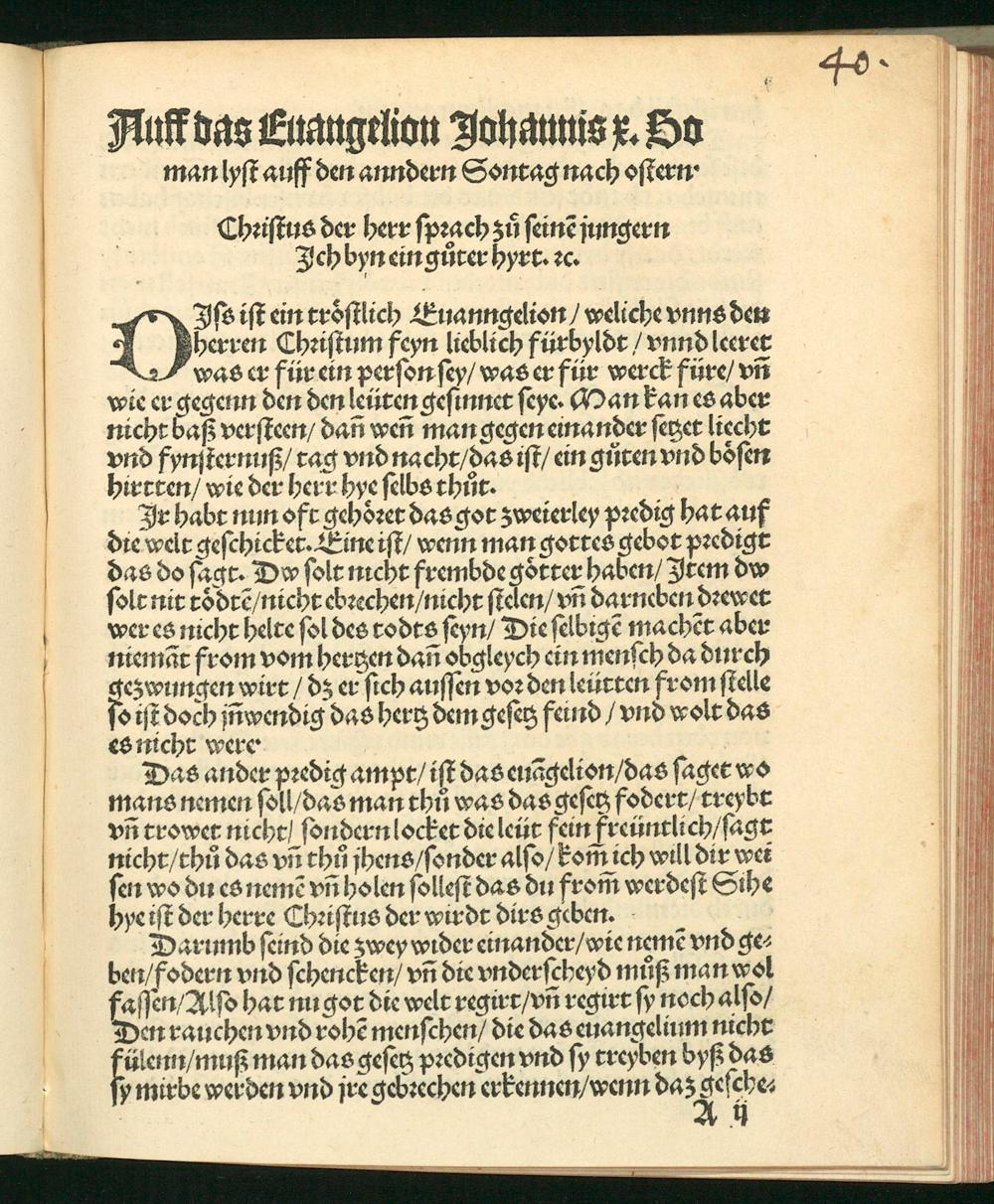 Das ander pꝛedig ampt/ iſt das euãgelion/ das ſaget wo mans nemen ſoll/ das man thů was das geſetz fodert/ treybt vñ trowet nicht/ ſondern locket die leüt fein freüntlich/ ſagt nicht/ thů das vñ thů jhens/ ſonder alſo/ EFom ich will dir wei ſen wo du es nemẽ vñ holen ſolleſt das du from̃ werdeſt Sihe hye iſt der herre Chꝛiſtus der wirdt dirs geben.