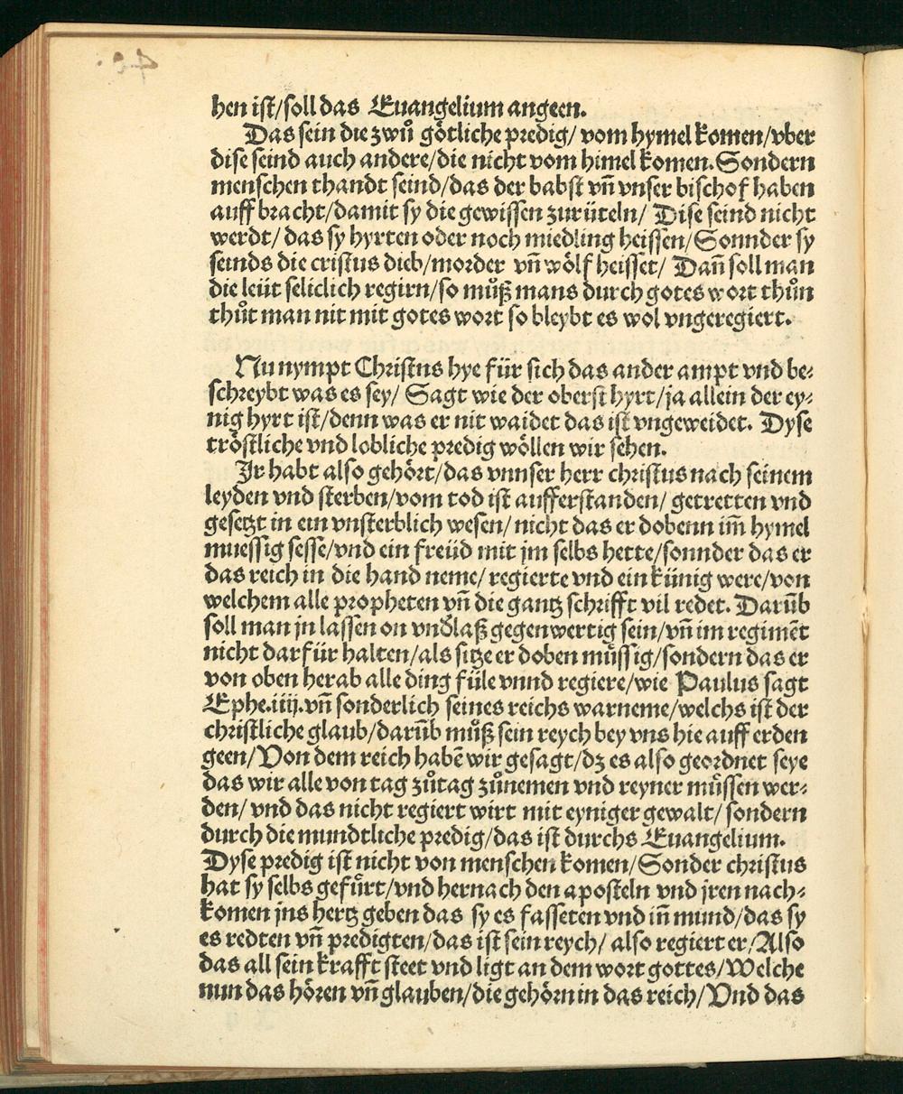 hen iſt/ oll das Euangelium angeen. Das ſein die zwů götliche pꝛedig/ vom hymel komen/ vber diſe ſeind auch andere/ die nicht vom himel komen. Sondern menſchen thandt ſeind/ das der babſt vñ vnſer biſchof haben auff bꝛacht/ damit ſy die gewiſſen zurüteln/ Diſe ſeind nicht werdt/ das ſy hyrten oder noch miedling heiſſen/ Sonnder ſy ſeinds die criſtus dich/ moꝛder vñ di eiſeg Dañ ſoll man die leüt ſeliclich regirn/ ſo můß mans durch gotes woꝛt thůn thůt man nit mit gotes woꝛt ſo bleybt es wol vngeregiert.
