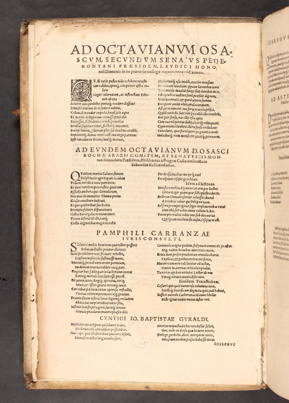 Vmplicito? opt as legum qui ſoluert nodos, Et clarum obſcuris addere poſſe iubar, Hec cape, quæ Oſoſci tribuit pia cura diſerti, Clamoſi vt tollat iurgia multa fori,