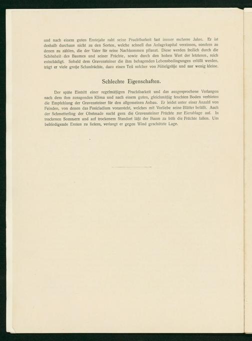 und nach einem guten Erntejahr ruht seine Fruchtbarkeit fast immer mehrere Jahre. Er ist deshalb durchaus nicht zu den Sorten, welche schnell das Anlagekapital verzinsen, sondern zu denen zu zählen, die der Vater für seine Nachkommen pflanzt. Diese werden freilich durch die Schönheit des Baumes und seiner Früchte, sowie durch den hohen Wert der letzteren, reich entschädigt. Sobald dem Gravensteiner die ihm behagenden Lebensbedingungen erfüllt werden, trägt er viele große Schaufrüchte, dazu einen Teil solcher von Mitielgröße und nur wenig kleine.