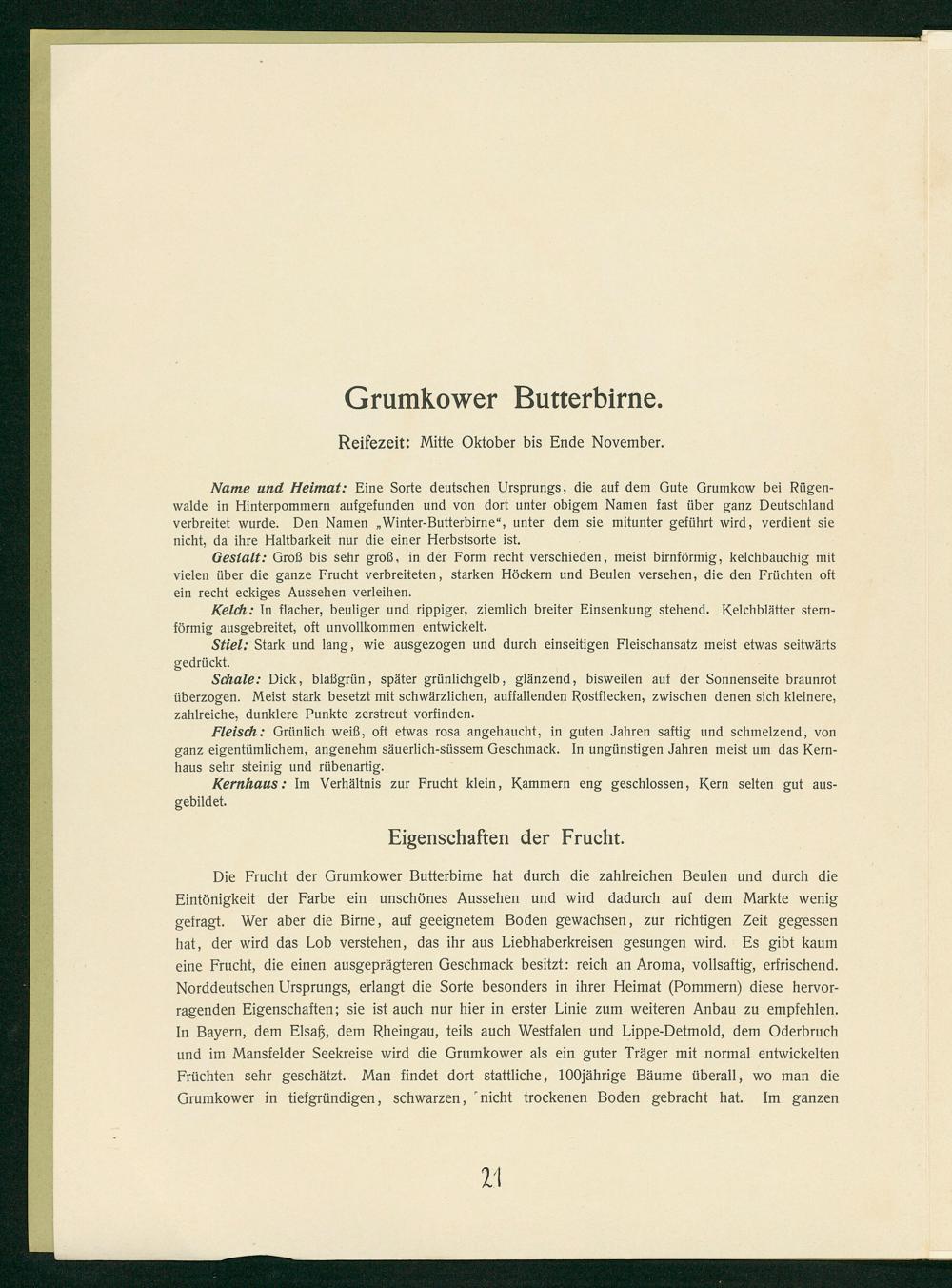 Die Frucht der Grumkower Butterbirne hat durch die zahlreichen Beulen und durch die Eintönigkeit der Farbe ein unschönes Aussehen und wird dadurch auf dem Markte wenig gefragt. Wer aber die Birne, auf geeignetem Boden gewachsen, zur richtigen Zeit gegessen hat, der wird das Lob verstehen, das ihr aus Liebhaberkreisen gesungen wird. Es gibt kaum eine Frucht, die einen ausgeprägteren Geschmack besitzt: reich an Aroma, vollsaftig, erfrischend. Norddeutschen Ursprungs, erlangt die Sorte besonders in ihrer Heimat(Pommern) diese hervor- ragenden Eigenschaften; sie ist auch nur hier in erster Linie zum weiteren Anbau zu empfehlen. In Bayern, dem Elsaß, dem Rheingau, teils auch Westfalen und Lippe-Detmold, dem Oderbruch und im Mansfelder Seekreise wird die Grumkower als ein guter Träger mit normal entwickelten Früchten sehr geschätzt. Man findet dort stattliche, 100jährige Bäume überall, wo man die Grumkower in tiefgründigen, schwarzen, nicht trockenen Boden gebracht hat. Im ganzen