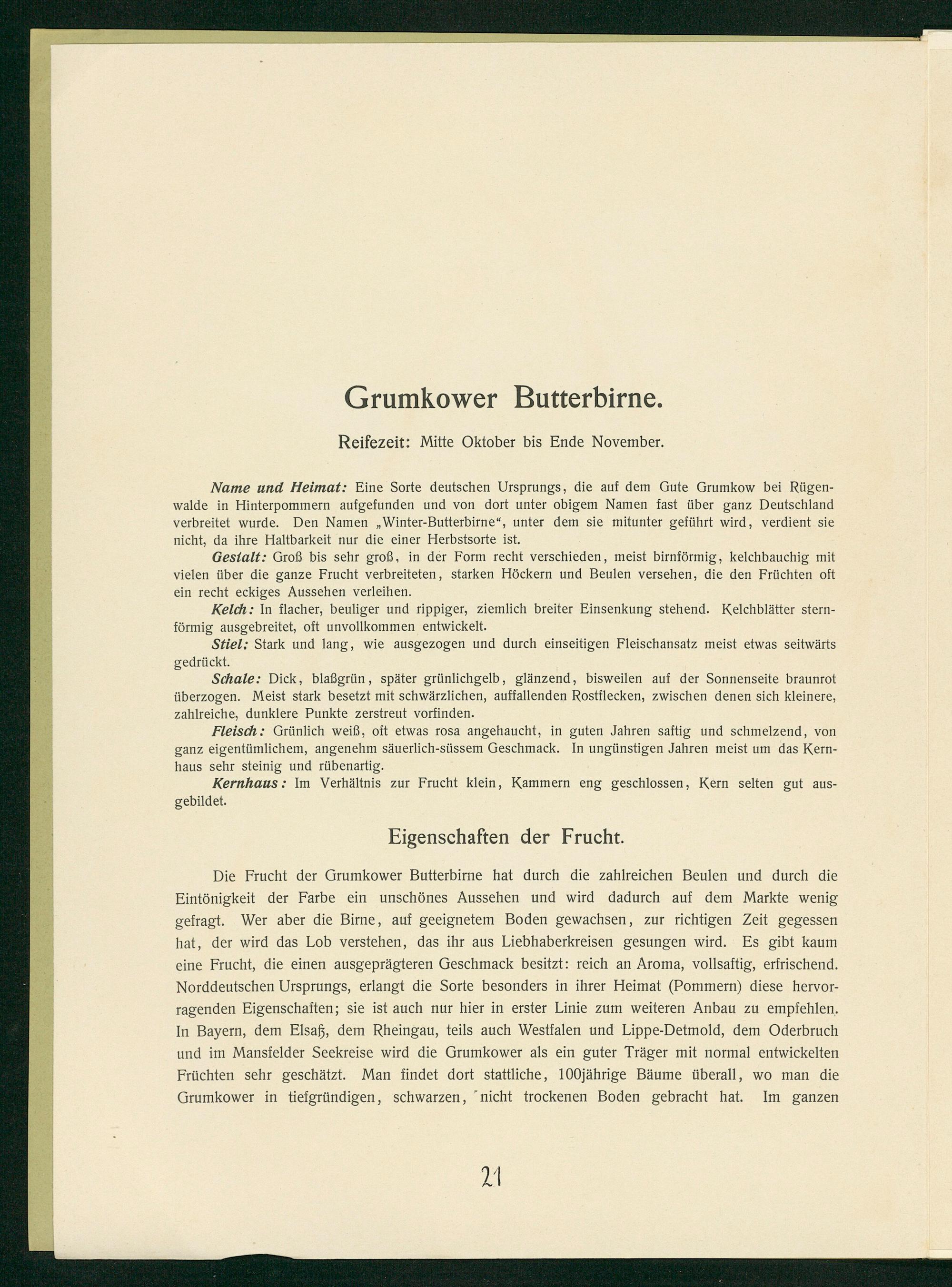 Name und Heimat: Eine Sorte deutschen Ursprungs, die auf dem Gute Grumkow bei Rügen- walde in Hinterpommern aufgefunden und von dort unter obigem Namen fast über ganz Deutschland verbreitet wurde. Den Namen„Winter-Butterbirne“, unter dem sie mitunter geführt wird, verdient sie nicht, da ihre Haltbarkeit nur die einer Herbstsorte ist.