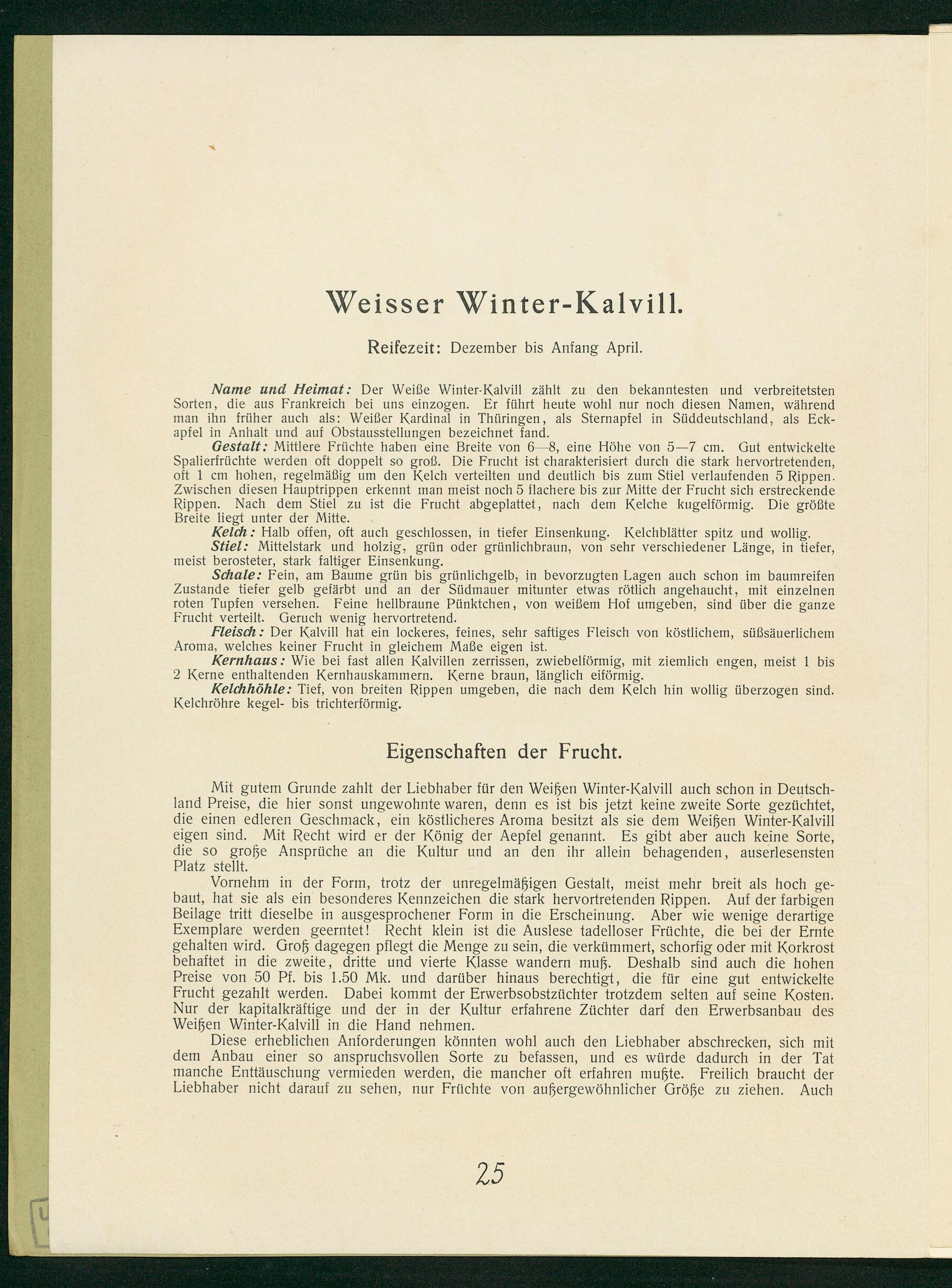 Mit gutem Grunde zahlt der Liebhaber für den Weißen Winter-Kalvill auch schon in Deutsch- land Preise, die hier sonst ungewohnte waren, denn es ist bis jetzt keine zweite Sorte gezüchtet, die einen edleren Geschmack, ein köstlicheres Aroma besitzt als sie dem Weißen Winter-Kalvill eigen sind. Mit Recht wird er der König der Aepfel genannt. Es gibt aber auch keine Sorte, die so große Ansprüche an die Kultur und an den ihr allein behagenden, auserlesensten Platz stellt.
