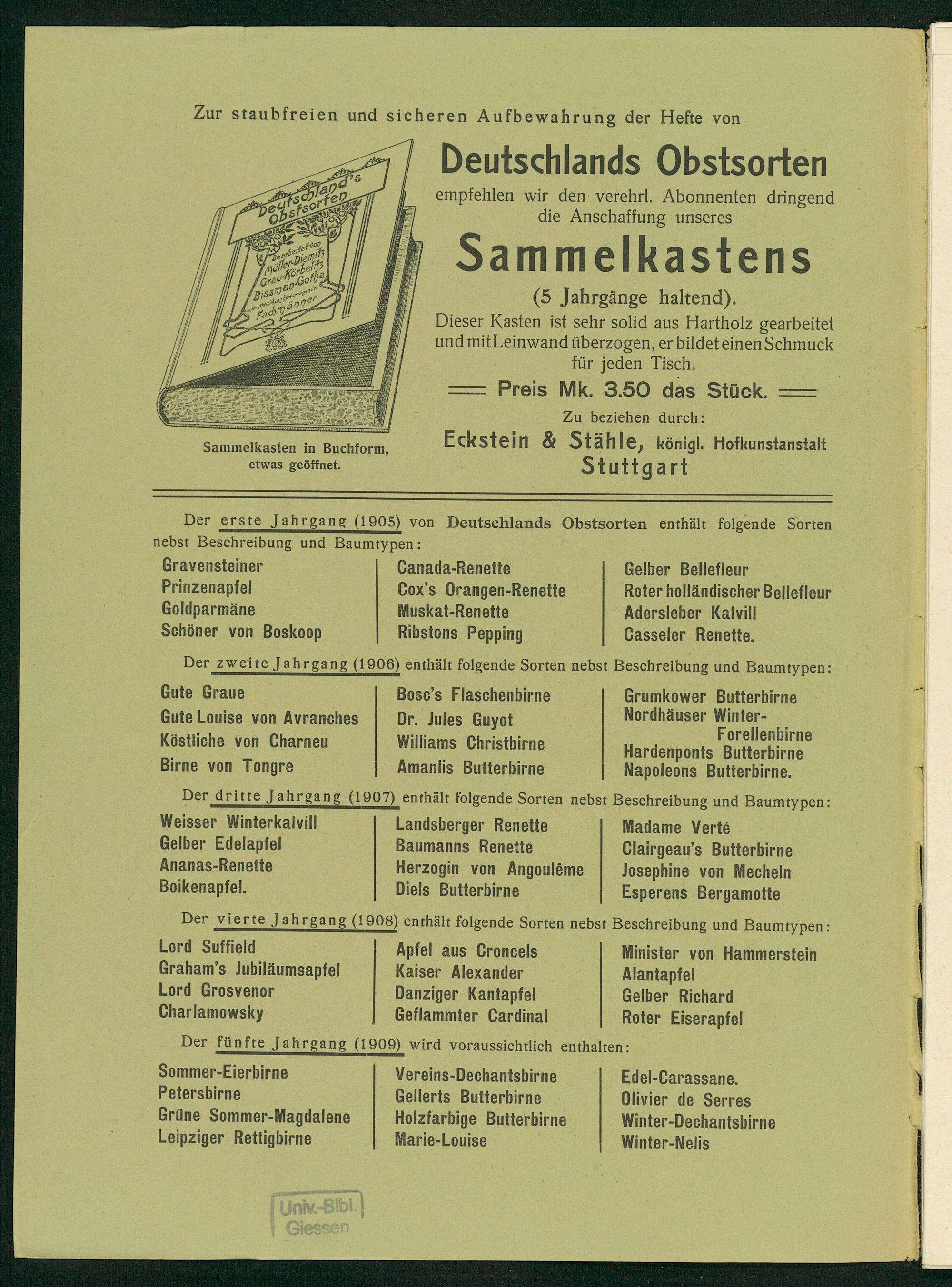Der zweite Jahrgang(1906) enthält folgende Sorten nebst Beschreibung und Baumtypen: