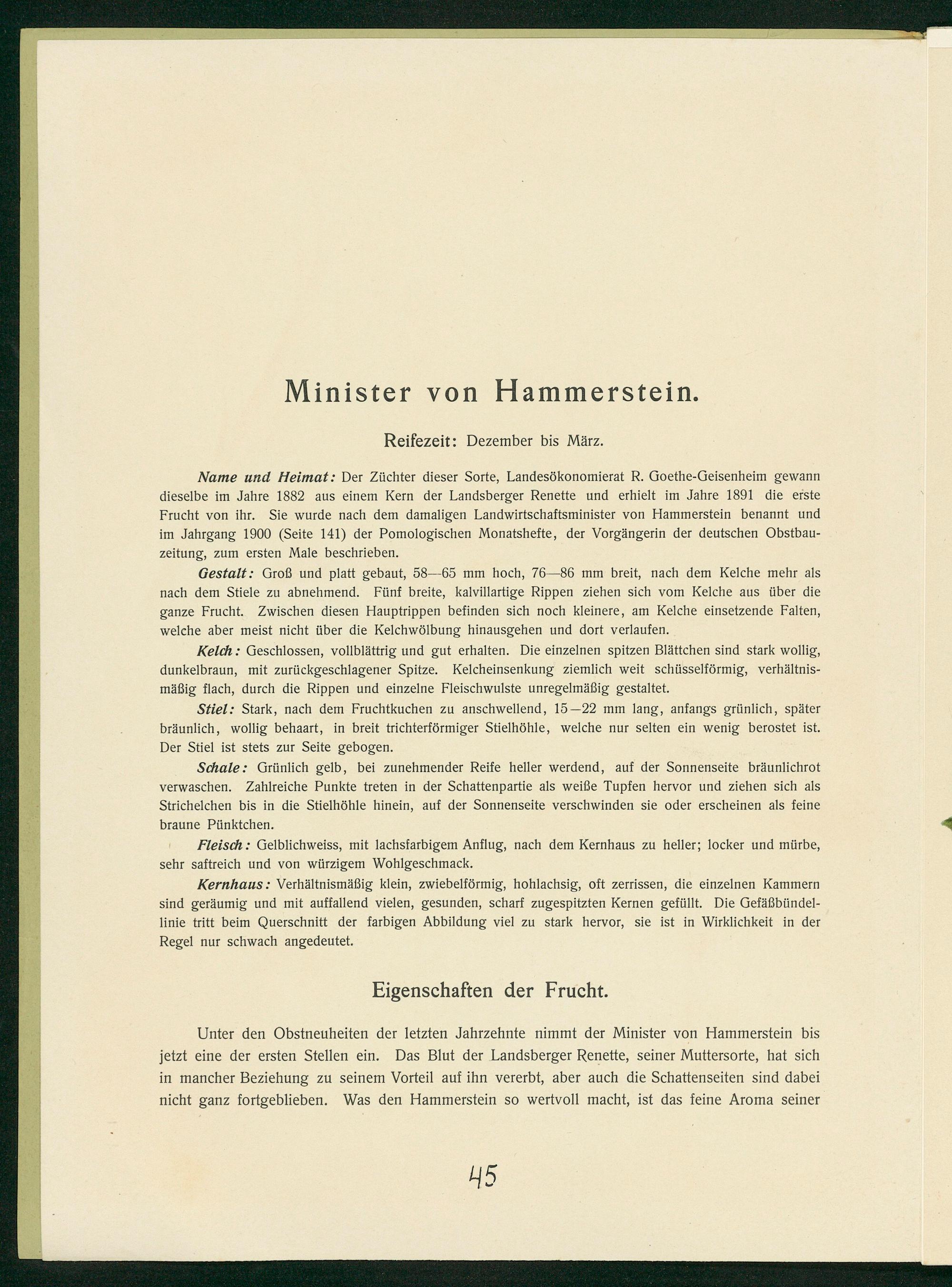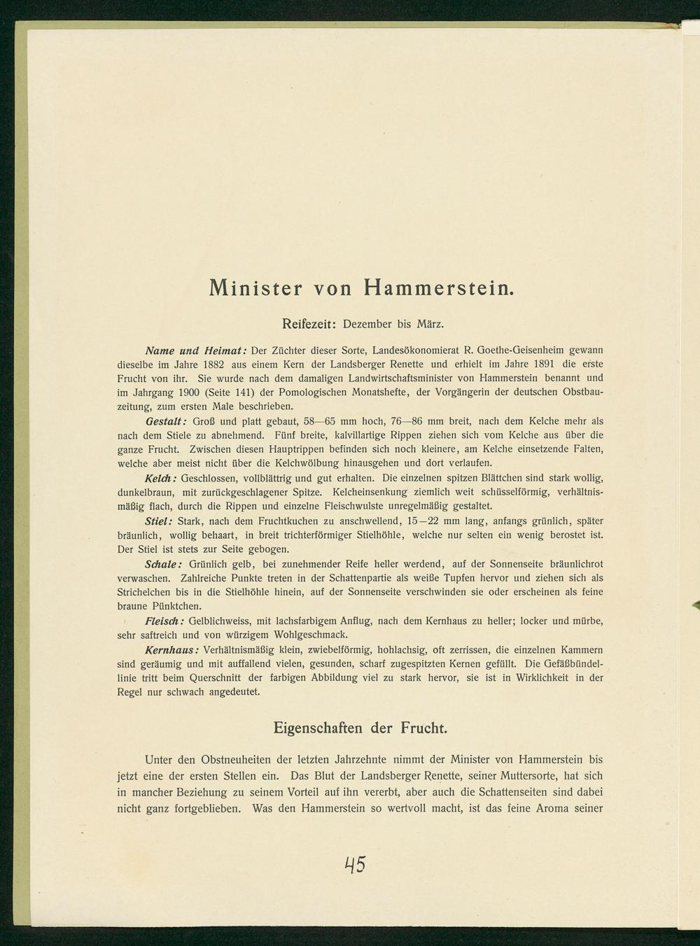 Unter den Obstneuheiten der letzten Jahrzehnte nimmt der Minister von Hammerstein bis jetzt eine der ersten Stellen ein. Das Blut der Landsberger Renette, seiner Muttersorte, hat sich in mancher Beziehung zu seinem Vorteil auf ihn vererbt, aber auch die Schattenseiten sind dabei nicht ganz fortgeblieben. Was den Hammerstein so wertvoll macht, ist das feine Aroma seiner