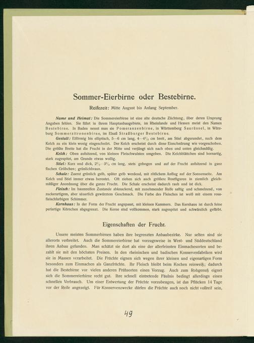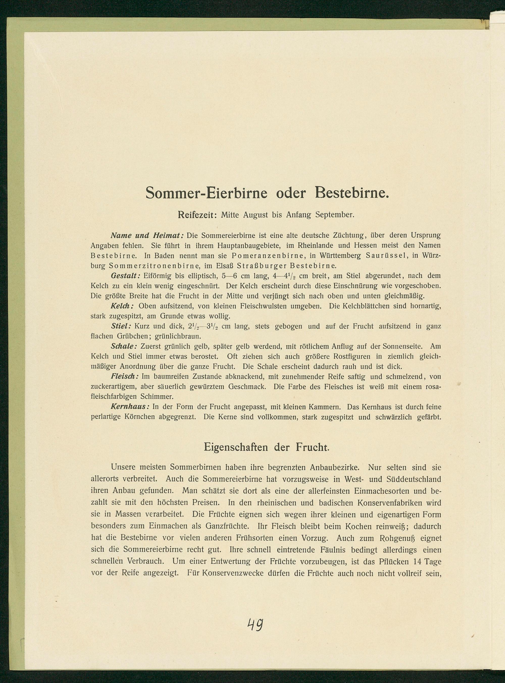 Nameèe und Heimat:. Die Sommereierbirne ist eine alte deutsche Züchtung, über deren Ursprung Angaben fehlen. Sie führt in ihrem Hauptanbaugebiete, im Rheinlande und Hessen meist den Namen Bestebirne. In Baden nennt man sie Pomeranzenbirne, in Württemberg Saurüssel, in Würz-— burg Sommerzitronenbirne, im Elsaß Straßburger Bestebirne.