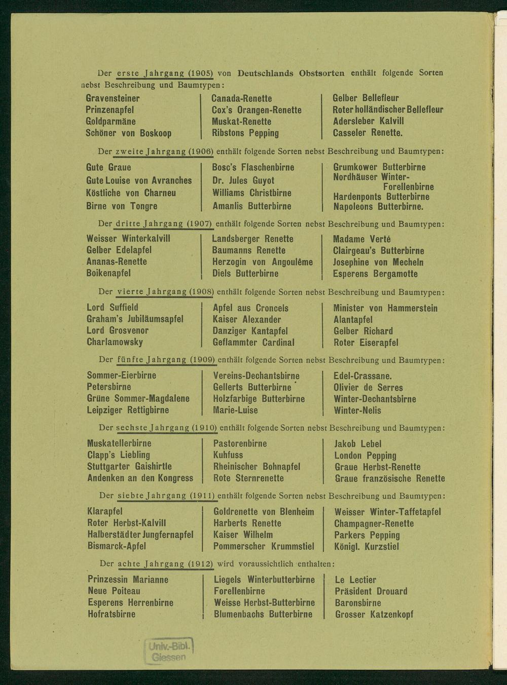 Der fünfte Jahrgang(1909) enthält folgende Sorten nebst Beschreibung und Baumtypen: