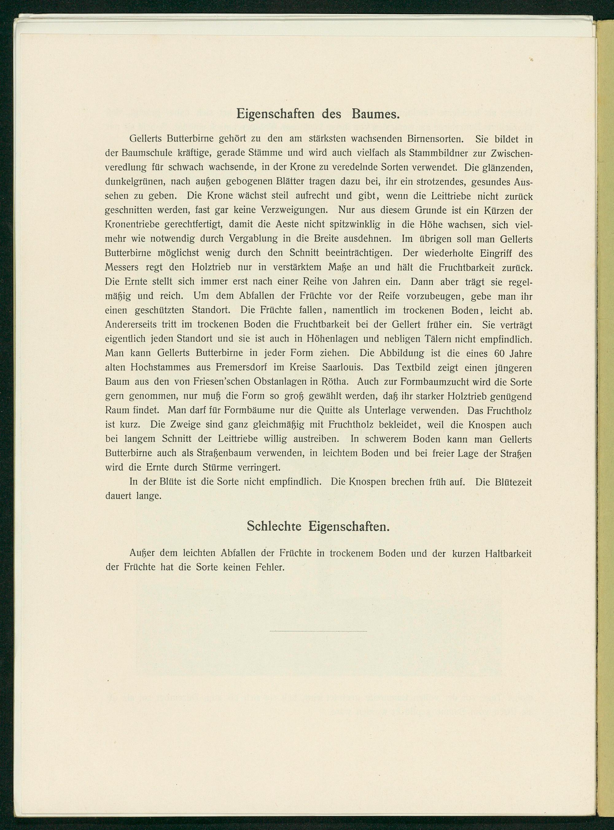 Gellerts Butterbirne gehört zu den am stärksten wachsenden Birnensorten. Sie bildet in der Baumschule kräftige, gerade Stämme und wird auch vielfach als Stammbildner zur Zwischen- veredlung für schwach wachsende, in der Krone zu veredelnde Sorten verwendet. Die glänzenden, dunkelgrünen, nach außen gebogenen Blätter tragen dazu bei, ihr ein strotzendes, gesundes Aus- sehen zu geben. Die Krone wächst steil aufrecht und gibt, wenn die Leittriebe nicht zurück geschnitten werden, fast gar keine Verzweigungen. Nur aus diesem Grunde ist ein Kürzen der Kronentriebe gerechtfertigt, damit die Aeste nicht spitzwinklig in die Höhe wachsen, sich viel- mehr wie notwendig durch Vergablung in die Breite ausdehnen. Im übrigen soll man Gellerts Butterbirne möglichst wenig durch den Schnitt beeinträchtigen. Der wiederholte Eingriff des Messers regt den Holztrieb nur in verstärktem Maße an und hält die Fruchtbarkeit zurück. Die Ernte stellt sich immer erst nach einer Reihe von Jahren ein. Dann aber trägt sie regel- mäßig und reich. Um dem Abfallen der Früchte vor der Reife vorzubeugen, gebe man ihr einen geschützten Standort. Die Früchte fallen, namentlich im trockenen Boden, leicht ab. Andererseits tritt im trockenen Boden die Fruchtbarkeit bei der Gellert früher ein. Sie verträgt eigentlich jeden Standort und sie ist auch in Höhenlagen und nebligen Tälern nicht empfindlich. Man kann Gellerts Butterbirne in jeder Form ziehen. Die Abbildung ist die eines 60 Jahre alten Hochstammes aus Fremersdorf im Kreise Saarlouis. Das Textbild zeigt einen jüngeren Baum aus den von Friesen'schen Obstanlagen in Rötha. Auch zur Formbaumzucht wird die Sorte gern genommen, nur muß die Form so groß gewählt werden, daß ihr starker Holztrieb genügend Raum findet. Man darf für Formbäume nur die Quitte als Unterlage verwenden. Das Fruchtholz ist kurz. Die Zweige sind ganz gleichmäßig mit Fruchtholz bekleidet, weil die Knospen auch bei langem Schnitt der Leittriebe willig austreiben. In schwerem Boden kann man Gellerts Butterbirne auch als Straßenbaum verwenden, in leichtem Boden und bei freier Lage der Straßen wird die Ernte durch Stürme verringert.