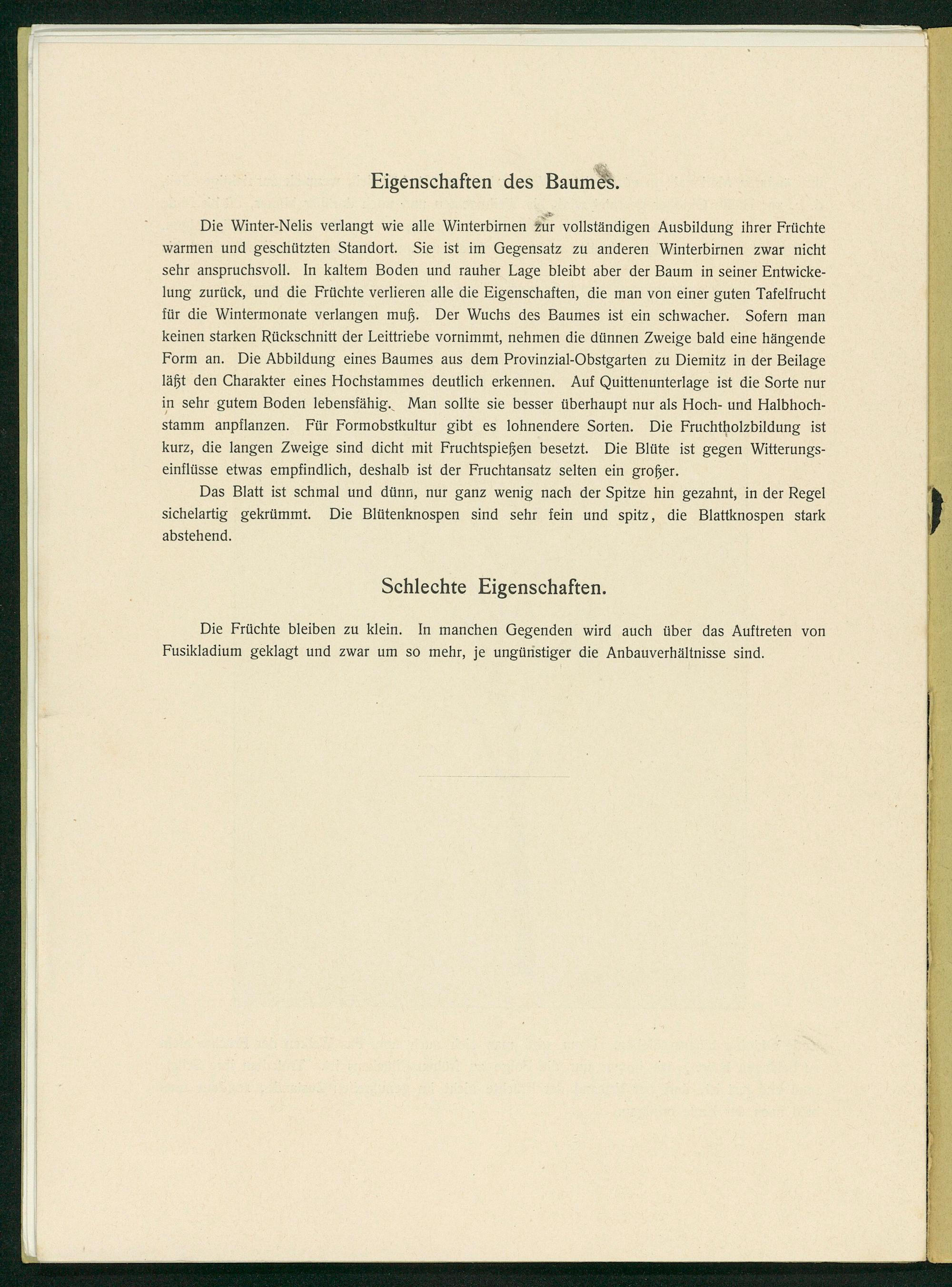 Die Winter-Nelis verlangt wie alle Winterbirnen zur vollständigen Ausbildung ihrer Früchte warmen und geschützten Standort. Sie ist im Gegensatz zu anderen Winterbirnen zwar nicht sehr anspruchsvoll. In kaltem Boden und rauher Lage bleibt aber der Baum in seiner Entwicke- lung zurück, und die Früchte verlieren alle die Eigenschaften, die man von einer guten Tafelfrucht für die Wintermonate verlangen muß. Der Wuchs des Baumes ist ein schwacher. Sofern man keinen starken Rückschnitt der Leittriebe vornimmt, nehmen die dünnen Zweige bald eine hängende Form an. Die Abbildung eines Baumes aus dem Provinzial-Obstgarten zu Diemitz in der Beilage läßt den Charakter eines Hochstammes deutlich erkennen. Auf Quittenunterlage ist die Sorte nur in sehr gutem Boden lebensfähig. Man sollte sie besser überhaupt nur als Hoch- und Halbhoch- stamm anpflanzen. Für Formobstkultur gibt es lohnendere Sorten. Die Fruchtholzbildung ist kurz, die langen Zweige sind dicht mit Fruchtspießen besetzt. Die Blüte ist gegen Witterungs- einflüsse etwas empfindlich, deshalb ist der Fruchtansatz selten ein großer.