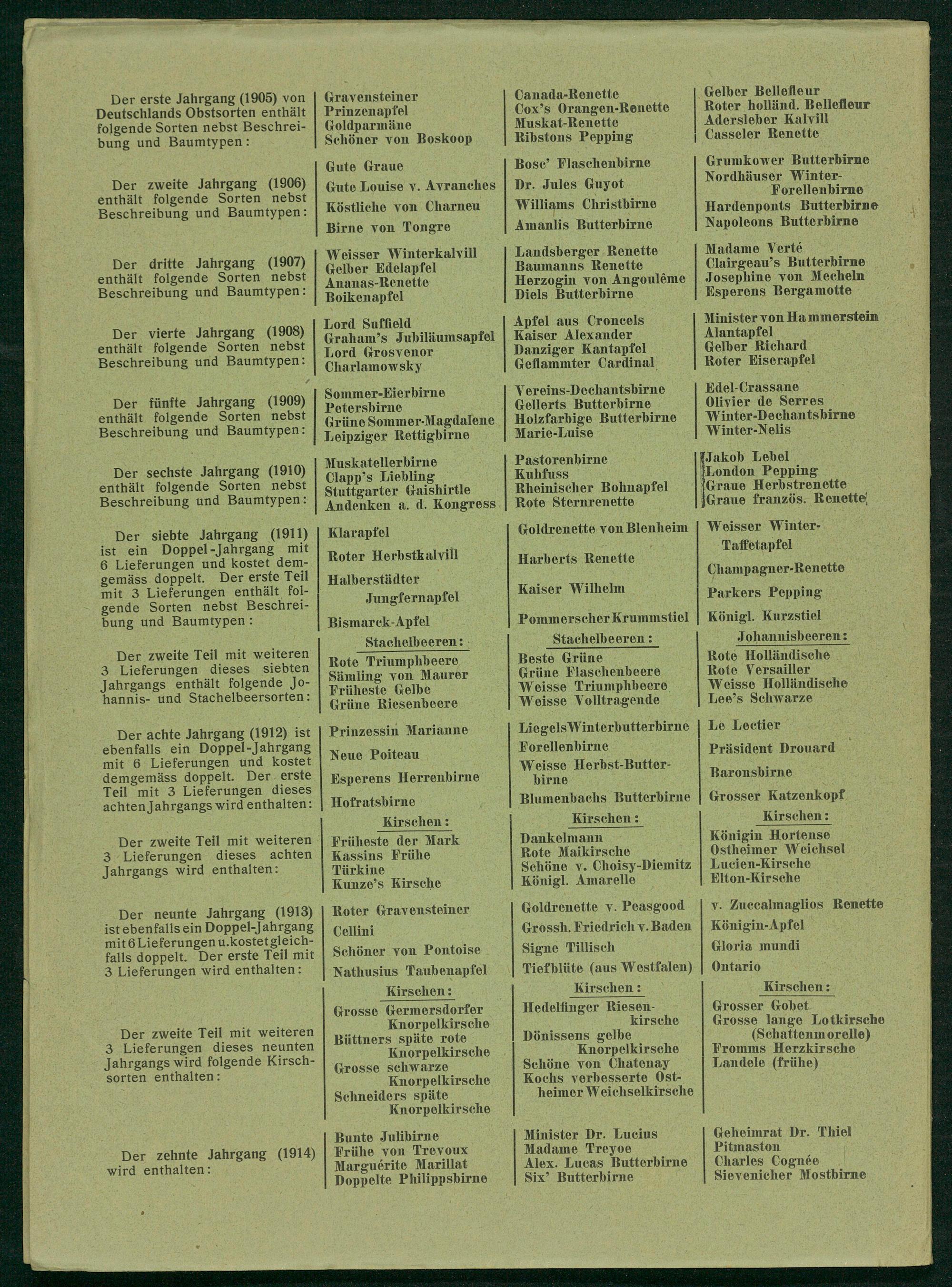 Der erste Jahrgang(1905) von Deutschlands Obstsorten enthält folgende Sorten nebst Beschrei- bung und Baumtypen: