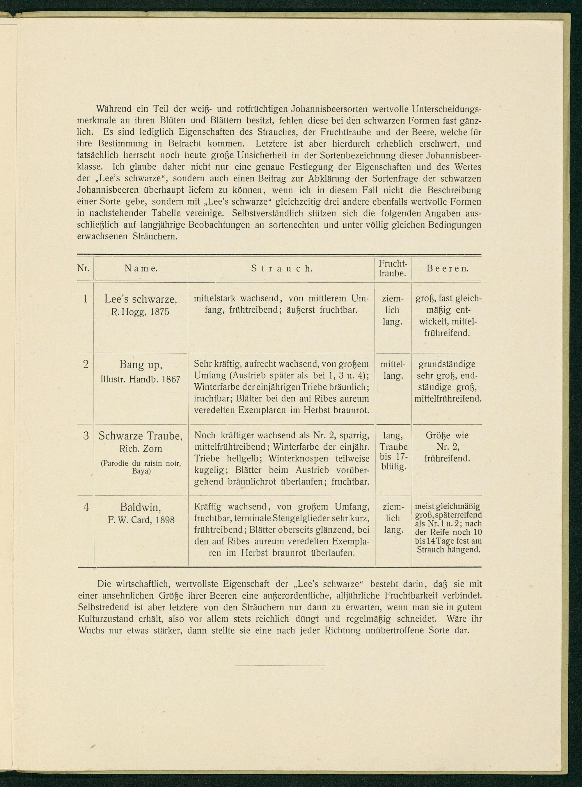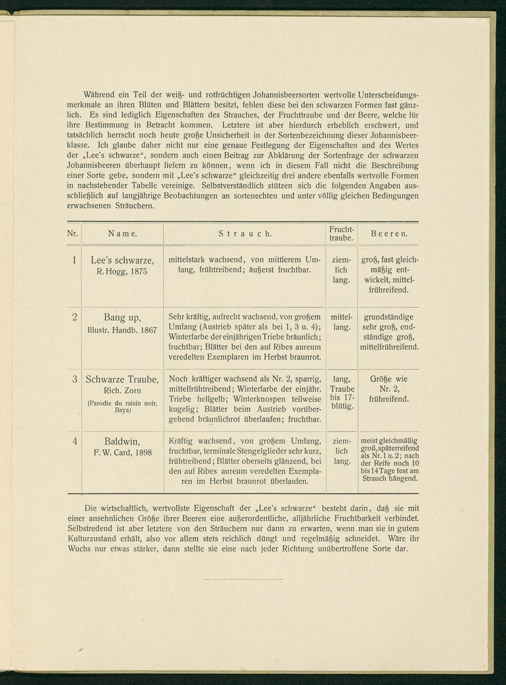 Während ein Teil der weiß- und rotfrüchtigen Johannisbeersorten wertvolle Unterscheidungs- merkmale an ihren Blüten und Blättern besitzt, fehlen diese bei den schwarzen Formen fast gänz- lich. Es sind lediglich Eigenschaften des Strauches, der Fruchttraube und der Beere, welche für ihre Bestimmung in Betracht kommen. Letztere ist aber hierdurch erheblich erschwert, und tatsächlich herrscht noch heute große Unsicherheit in der Sortenbezeichnung dieser Johannisbeer- klasse. Ich glaube daher nicht nur eine genaue Festlegung der Eigenschaften und des Wertes der„Lee's schwarze“, sondern auch einen Beitrag zur Abklärung der Sortenfrage der schwarzen Johannisbeeren überhaupt liefern zu können, wenn ich in diesem Fall nicht die Beschreibung einer Sorte gebe, sondern mit„Lee's schwarze“ gleichzeitig drei andere ebenfalls wertvolle Formen in nachstehender Tabelle vereinige. Selbstverständlich stützen sich die folgenden Angaben aus-