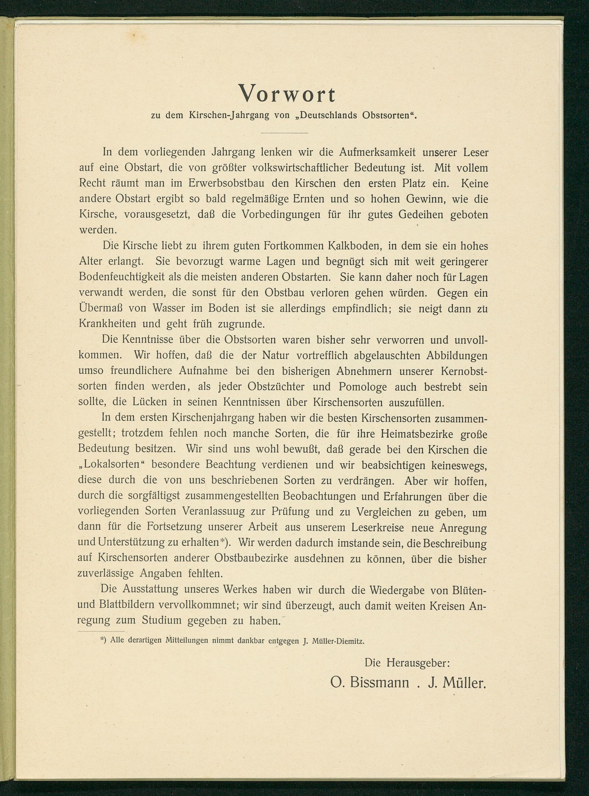 Die Kenntnisse über die Obstsorten waren bisher sehr verworren und unvoll- kommen. Wir hoffen, daß die der Natur vortrefflich abgelauschten Abbildungen umso freundlichere Aufnahme bei den bisherigen Abnehmern unserer Kernobst- sorten finden werden, als jeder Obstzüchter und Pomologe auch bestrebt sein sollte, die Lücken in seinen Kenntnissen über Kirschensorten auszufüllen.