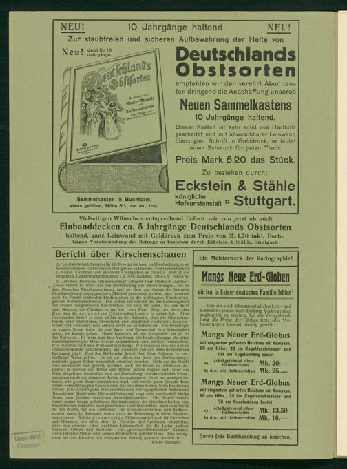 der Landwirtschaftskammer für die Provinz Sachsen und Beobachtungen an Kirschenbäumen im Provinzial-Obstgarten zu Diemitz. Von Gartendirektor J. Müller, Vorsteher des Provinzial-Obstgartens zu Diemitz. Heft 21 der Arbeiten d. Landwirtschaftskammer f. d. Prov. Sachsen, Halle a. S. Preis 1 M.