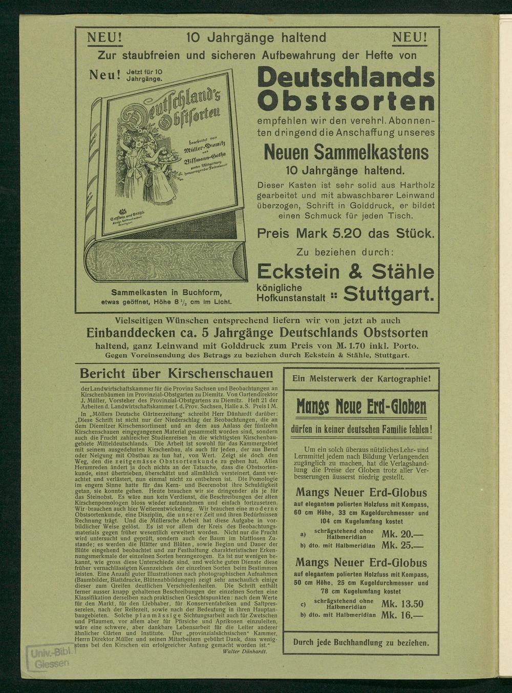 der Landwirtschaftskammer für die Provinz Sachsen und Beobachtungen an Kirschenbäumen im Provinzial-Obstgarten zu Diemitz. Von Gartendirektor J. Müller, Vorsteher des Provinzial-Obstgartens zu Diemitz. Heft 21 der Arbeiten d. Landwirtschaftskammer f. d. Prov. Sachsen, Halle a. S. Preis 1 M.