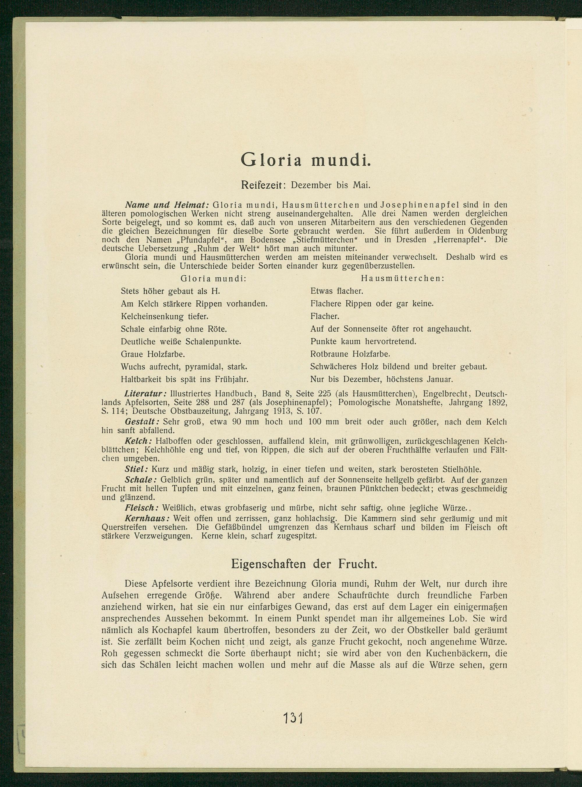 Gloria mundi: Hausmütterchen: Stets höher gebaut als H. Etwas flacher. Am Kelch stärkere Rippen vorhanden. Flachere Rippen oder gar keine. Kelcheinsenkung tiefer. Flacher. Schale einfarbig ohne Röte. Auf der Sonnenseite öfter rot angehaucht. Deutliche weiße Schalenpunkte. Punkte kaum hervortretend. Graue Holzfarbe. Rotbraune Holzfarbe. Wuchs aufrecht, pyramidal, stark. Schwächeres Holz bildend und breiter gebaut. Haltbarkeit bis spät ins Frühjahr. Nur bis Dezember, höchstens Januar.