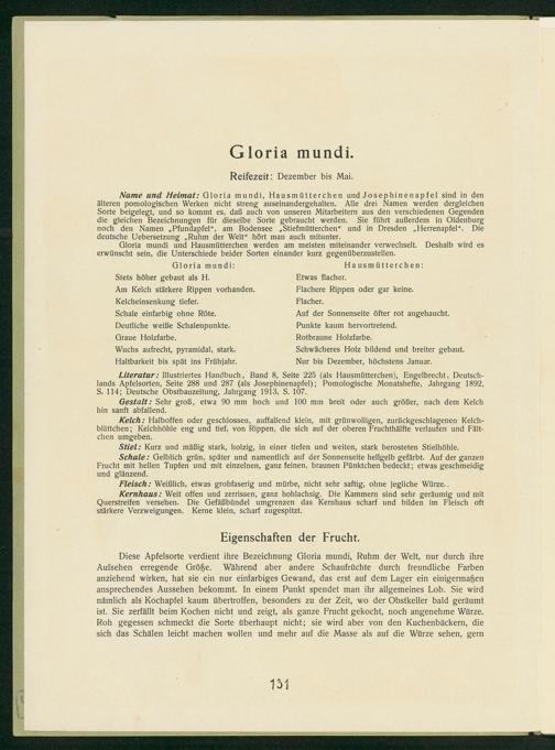 Name und Heimat.: Gloria mundi, Hausmütterchen und Josephinenapfel sind in den älteren pomologischen Werken nicht streng auseinandergehalten. Alle drei Namen werden dergleichen Sorte beigelegt, und so kommt es, daß auch von unseren Mitarbeitern aus den verschiedenen Gegenden die gleichen Bezeichnungen für dieselbe Sorte gebraucht werden. Sie führt außerdem in Oldenburg noch den Namen„Pfundapfel“, am Bodensee„Stiefmütterchen“ und in Dresden„Herrenapfel“. Die deutsche Uebersetzung„Ruhm der Welt“ hört man auch mitunter.