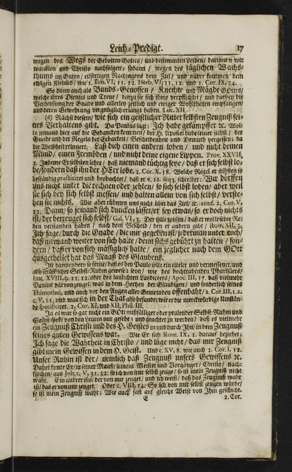 It dannenhero ſo ferne/ daß es bey Paulo ſolte ein eiteler und vermeſſener/ und aſo ſtraͤff icher Selbſi⸗Ruhm geweſen ſeyn/ wie des hochtrabenden Phariſaͤers/ kuc. XVIII,. 1 r. 12/oder des laulichten Laodiceers/ Apoc. III, 17. daß vielmehr Paulus darvonzeuget/ was in dem Hertzen der Glaubigen/ und ſonderlich ſeines Thimothei, und auch vor den Augen aller Gemeinden offenbahr/ 2. Cor. III, 1.2. c. V, 1r. und was ſich in der That alſo befandez wie er die merckwuͤrdige Umſtaͤn⸗
