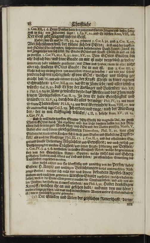 Anbey aber auch ſeinem gleichgeſinnten Thimotheo, Phil. II, 20. ſamt allen Gliedern der ſtreitenden Kirchen ſich ſo wohl zum Muſter und Fuͤrbild der Tapffer⸗ keit/ als auch der Nachfolge/ Phil III, 17. 1. Cor. II. 1. und des erhaltenden Sie⸗ ges und Lauffs Vollendung Moͤglichkeit und Gewißheit; wie auch endlich zur Beſchaͤmung der meiſten Traͤgheit/ und ſeiner Feinde Laͤſterung und Boßheit/ I. Cor. IV, 3. 4.§. 6. vorſtellen/ in ſolchen Gleichniß⸗Reden/ welche hergenommen und von dadeeaelechſen Ritzerr Sdielen, welche nicht nur aus Scherz