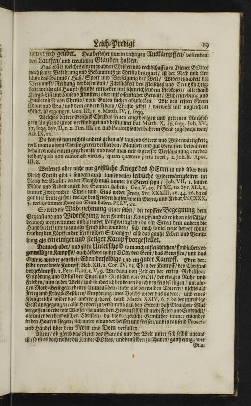 Dennoch aber, und zum Unterſcheid ſo manches fleiſchlichen/ ſundlichen/ et⸗ genwilligen Kampffẽ/ auchoͤffters wider GOtt/ den Geiſt/ das Gewiſſen/ und das Gute z.. wirder genenet: Eben derſelbige und ein guter Kampff. Eben der⸗ ſelbe verordnete Kampff. Heb. XII, 2. Cor. IV, 13. Eben der Kampff/ den Chriſtus vorgekaͤmpfft. 1. Petr. II, z1. c. V, o. Wie dann von Zeit an der erſten Rebellion/ Empdrung und Abfall der Engel und Menſchen von Gott/ der ewigen Ruhe und Frieden/ nun in der Welt/ und ſonderlich bey denen durch den feindſeeligen/ unruhi⸗ gen Mord⸗Geiſt getriebenen Unmenſchen/ inehr als bey wilden Thieren/ nichts als Krieg und Kriegs⸗Geſchrey/ Emporung eines Volcks wider das andere/ und eines Koͤnigreichs wider das andere gehoret wird. Matth. XXIV, 6. 7. da der unruhige Geiſt ausgegangen/ alle Heyden zu verſammlenin den Streit/ daß Menſchen⸗Blut vergoſſen werde wie Waſſer; ja unter den Heyden ſelbſt iſt mehr Fried und Eintrucht/ als unter den heyduiſchen Ehriſten; da die kriegeriſche Gemuͤther immer einander in den Haaren liegen/ ſich unter einander beiſſen und freſſen/ und in tauſend Proceſs und Haͤndel über dem Mein und Dein verfallen.