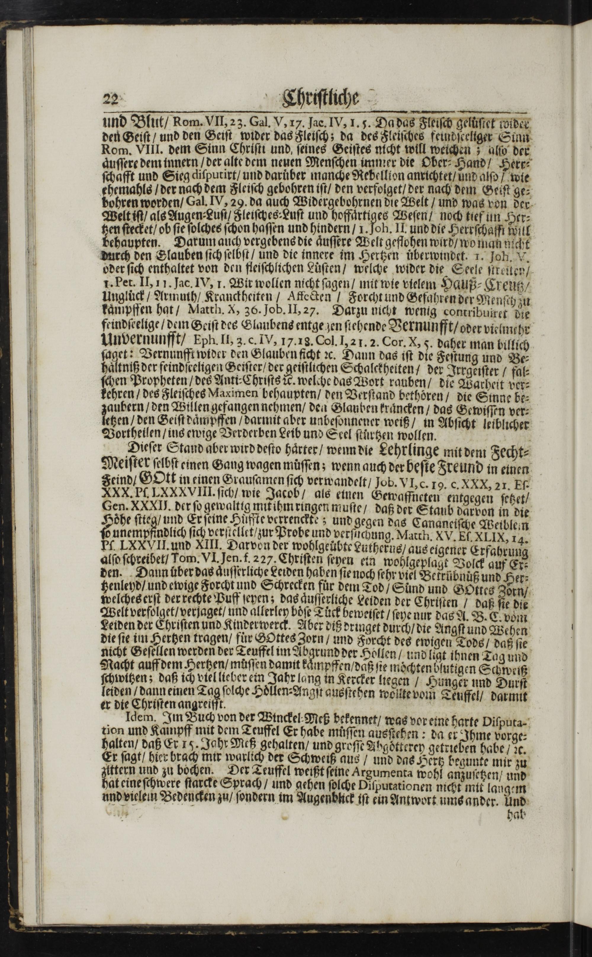 Meiſter ſelbſt einen Gang wagen muſſen; wenn auch der beſte Freund in einen Feind/ GOtt in einen Grauſamen ſich verwandelt/ Job. VI, c. 19. c. XXX, 21. Eſ⸗ XXX. Pf. LXXXVIII. ſich/ wie Jacob als einen Gewaffneten entgegen ſetzet/ Gen. XXXII. der ſo gewalttg mit ihm ringen muſte/ daß der Staub darvon in die Hoͤhe ſtteg/ und Er ſeine Huͤffte verrenckte; und gegen das Cananeiſche Weiblein Hunemp ndlich ſich verſtellet/ zur Probe und verſuchung. Match. XV. Ef. XLIX, 1 4. Pſ LXXVII. und XIII. Darvon der wohlgeuͤbte Lutherus/ aus eigener Erfahrung alſo ſchreibet/ Jom. VI. Jen. f. 227. Chriſten ſeyen ein wohlgeplagt Volck auf Er⸗ den. Dann uͤber das aͤuſſerliche Leiden haben ſie noch ſehr viel Betrubnuß und Her⸗ tzenleyd/ und ewige Forcht und Schrecken fuͤr dem Tod/ Sund und GOttes korn/ welcheserſt der rechte Puff leyen; das auſſerliche Leiden der Chriſten/ daß ſie die Welt verfolget/ verjaget/ und allerley boͤſe Tuͤck beweiſet/ ſeye nur das A. B. C vom Leiden der Chriſten und Kinderwerck. Aber diß dringet durch/ die Angſt und Wehen die ſie im Hertzen tragen/ fuͤr SOttes Zorn/ und Forcht des ewigen Tods/ daß ſie nicht Geſellen werden der Teuffel im Abgrund der Hollen/ und ligt ihnen Ta gund Nacht auff dem Hertzen/ muͤſſen damit kaͤmpffen/ daß ſie moͤchten blutigen Schweiß ſchwitzen; daß ich viel lieber ein Jahr lang in Kercker liegen/ Hunger und Durſt leiden/ dann einen Tag ſolche Hollen⸗Angſt ausſtehen wolite voin Teuffel/ darmit er die Chriſten angreifft. 1