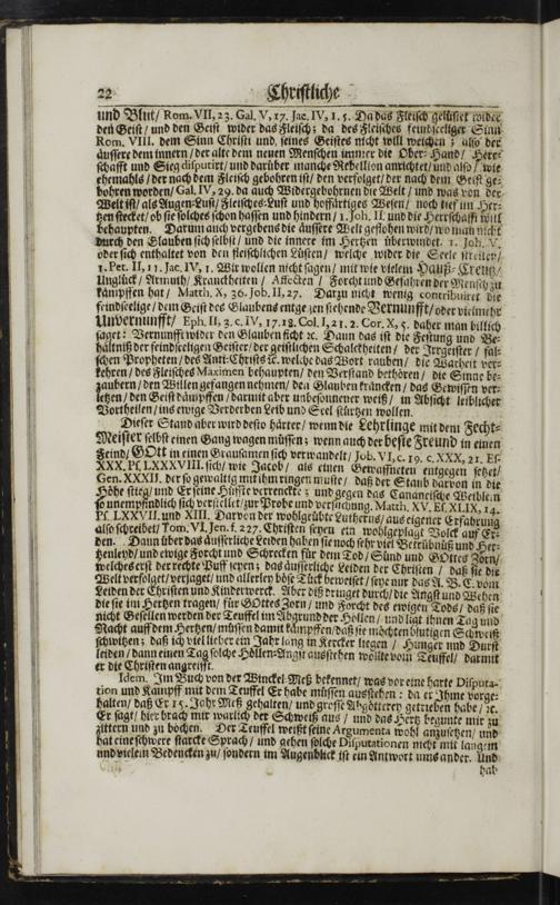 22 Chriſtliche und Blut/ Rom. VII, 23. Gal. V, 17. Jac. IV, I. 5. Da das Fleiſch geluͤſtet wider den Geiſt/ und den Geiſt wider das Fleiſch; da des Fleiſches feindſeeliger Sinn Rom. VIII. dem Sinn Chriſti und ſeines Geiſtes nicht will weichen; allo der aͤuſſere dem innern/ der alte dem neuen Menſchen immer die Ober⸗Hand/ Herr⸗ ſchafft und Sieg diſpurirt/ und darüber manche Rebellion anrichtet/ und alſo/ wie ehemahls/ der nach dem Fleiſch gebohren iſt/ den verfolget/ der nach dem Geiſt ge⸗ bohren worden/ Gal. IV, 29. da quch Widergebohrnen die Welt/ und was von der Welt iſt/ als Augen⸗Luſt/ Fleiſches⸗Luſt und hoffaͤrtiges Weſen/ noch tief un Her⸗ en ſtecket/ ob ſie ſolches ſchon haſſen und hindern/ I. Ioh. II und die Herrſchafft wwill ehaupten. Darum auch vergebens die aͤuſſere Welt geflohen wird/ wo man nicht durch den Slauben ſich ſelbſt/ und die innere im Hertzen uͤberwindet. 1. Joh. W. oder ſich enthaltet von den fleiſchlichen Luͤſten/ welche wider die Seele ſtreiten/ 1. Pet. II, 11. Jac. IV, 1. Wir wollen nicht ſagen/ mit wie vielem Hauß⸗ Creutz/ Unglück/ Armuth/ Kranckheiten/ Affecten/ Forcht und Gefahren der Menſch zu kampffen hat/ Matth. X, 36. Job. II, 27. Darzu nicht wenig contribuiret die feindſeelige/ dem Geiſt des Slaubens entge zen ſtehende Vernunfft/ oder vielmnehr Unvernunfft/ Eph. II, 3. c. IV, 17.18. Col. I, 21. 2. Cor. X, 5. daher man billich ſaget: Vernunfft wider den Glauben ficht ꝛc. Daunn das iſt die Feſtung und Be⸗ haltniß der feindſeeligen Geiſter/ der Aeiſllchen Schalckheiten/ der Irrgeiſter/ fal⸗ ſchen Propheten/ des Anti⸗Chriſts dc. welche das Wort rauben/ die Warheit ver⸗ kehren/ des Fleiſches Maximen behaupten/ den Verſtand bethoͤren/ die Sinne be⸗ aubern/ den Willen gefangen nehmen/ den Glauben kraͤncken/ das Gewiſſen ver⸗ tzen/ den Geiſt daͤmpffen/ darmit aber unbeſonnener weiß/ in Abſicht leiblicher Vortheilen/ ins ewige Verderben Leib und Seel ſtuͤrtzen wollen.