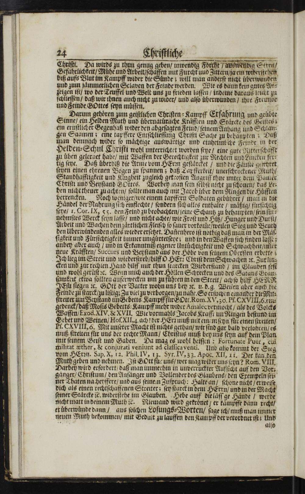 . CXVIII, 6. Mit unſerer Macht iſt nichts gethan/ wir ſind gar bald verlohren/ es muß ſtreiten fuͤr uns der rechte Mann/ Chriſtus muß bey uns ſeyn auf dem Plan mit ſeinem Geiſt und Gaben. Da mag es wohl heiſſen: Fortunate Puer, cui militat æther,& conjurati veniunt ad claſſicaventi. Und alſo kommt der Sieg vom HErꝛn. Sap. X, 12. Phil. IV, 13. Syr. IV, 33. Apoc. XII, It. Der kan den Muth geben und nehmen. Iſt GOtt fur uns/ wer mag wider uns ſeyn? Rom. VIII. Darbeh wird erfordert/ daß man immerhin in unverruckter Aufſicht auf den Vor⸗ gaͤnger/ Chriſtum/ den Anfaͤnger und Vollender des Glaubens/ den Exempeln ſei⸗ ner Thaten nacheyffere/ und aus ſeinen Zuſpruch: Halte an ſchone nicht/ erweiſe dich als einen rechtſchaffenen Streiter; ſey ſtarckin dem HErrn/ und in der Macht ſeiner Staͤrcke ic. widerſtehe im Glauben. Hebe auff die laͤſſ ge Haͤnde/ werde nicht matt in deinem Muth ic. Niemand wird gekronet/ er kaͤmpffe dann recht/