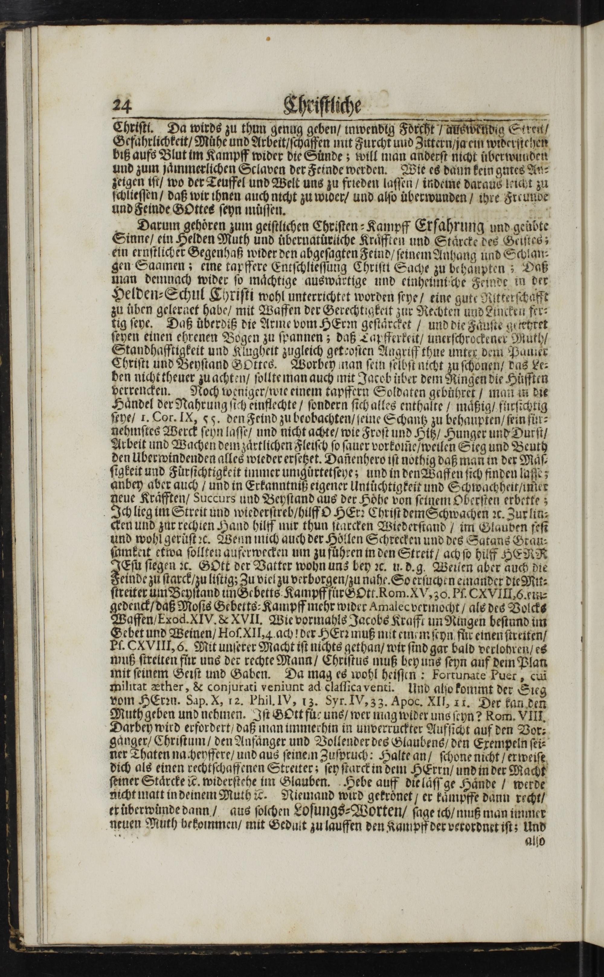 24 Fhriſckehe Thriſti. Da wirds zu thun genug geben/ inwenbig Forcht/ auswendig Streu/ Gefahrlichkeit/ Muͤhe und Arbeit/ ſchaffen mit Furcht und Zuttern/ ja ein widerſtehen biß aufs Blut im Kampff wider die Sunde; will man anderſt nicht uberwunden und zum jaͤmmerlichen Sclaven der Feinde werden. Wie es dann kein giies An⸗ zeigen iſt/ wo der Teuffel und Welt uns zu frieden laſſen/ indeme daraus leicht zu ſchlieſſen/ daß wir ihnen auch nicht zu wider/ und alſo uberwunden/ ihre Frrunde und Feinde GOttes ſeyn muͤſſen. 21. Darum gehoͤren zum geiſtlichen Chriſten⸗Kampff Erfahrung und geubte Sinne/ ein Helden Muth und uͤbernatuͤrliche Kraͤfften und Staͤrcke des Geiſtes; ein ernſtlicher Gegenhaß wider den abgeſagten Feind/ ſeinem Anhang und Schlan⸗ gen Saamen; eine tapffere Entſchlieſſung Chriſtt Sache zu behanpten; Daß man demnach wider ſo maͤchtige auswaͤrtige und einheimtche Feinde in der Helden⸗Schul Chriſti wohl unterrichtet worden ſeye/ eine gute Ritterſchafft zu uͤben gelernet habe/ mit Waffen der Gerechtigkeit zur Rechten und Lincken fer⸗ tig ſeye. Daß uͤberdiß die Arme vom HErnn geſtaͤrcket/ und die Faͤuſte getehret ſeyen einen ehrenen Bogen zu ſpannen; daß Tapfferkeit/ unerſchrockener Muth/ Standhafftigkeit und Klugheit zugleich geteoſten Angriff thue unter dem Pauer Chriſt: und Beyſtand SOktes. Worbey nan ſein ſelbſt nicht zu ſchonen/ das Le⸗ den nicht theuer zu achten/ ſollte man auch mit Jaceb über dem Ringen die Huͤfften Perenten. Noch weniger/ wie einem tapffern Soldaten gebuhret/ man in die aͤndel der Nahrung ſich einflechte/ ſondern ſich alles enthalte/ maͤßig/ furſichtig ſeye/ 1. Cor. IX, 55. den Feind zu beobachten/ ſeine Schantz zu behaupten/ ſein ful⸗ nehmſtes Werck ſeyn laſſe/ und nicht achte/ wie Froſt und Hitz/ Hunger und Durſt/ Arbeit und Wachen demzaͤrtlichen Fleiſch ſo ſauer vorkomeſwetlen Sieg und Beuth den Uberwindenden alles wieder erſetzet. Danenhero iſt nothig daß man in der Maͤſ⸗ ſigkeit und Fuͤrſichtigkeit immer umguͤrtetſeye; und in den Waffen ſich finden laſſe; anbey aber auch/ und in Erkanntniß eigener Untuͤchtigkeit und Schwachheit/ imier neue Kraͤfften/ Succurs und Beyſtand aus der Hoͤhe von ſeinem Oberſten erbette; Ich lieg im Streit und wiederſtreb/ hilff O HEr: Chriſt dem Schwachen ꝛc. Zur lin⸗