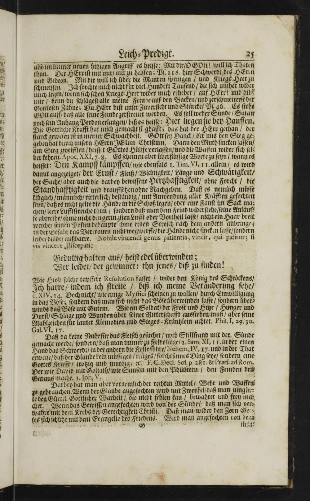 Gedultig halten aus/ heiſt edeluͤberwinden; Wer leidet/ der gewinnet: thu jenes/ diß zu finden! Wie Hiob ſolche tapffere Reſolurion faſſet/ wider den Koͤnig des Schroͤckens/ Ich harre/ indem ich ſtreite/ biß ich meine Veraͤnderung ſehe/ d. XIV, 14. Doch nicht/ wie einige Ayſtici ſcheinen zu wollen/ durch Einwilligung in das Boͤſe; ſondern daß man ſich nicht das Boͤſe üͤberwinden laſſe/ ſondern uͤber⸗ winde das Boͤſe mit Gutem. Wie ein Soldat/ der Froſt und Hihe/ Hunger und Durſt/ Schlaͤge und Wunden über ſeiner Ritterſchafft ausſtehen muß/ aber ſeine Mahlzeichen fuͤr lauter Kleinodien und Sieges⸗Kraͤntzlein achtet. Phil. I, 29. 30.