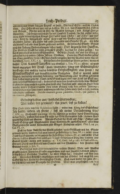 Leich⸗Predigt. 25 alſo im immer neuen hitzigen Anagriff es heiſſe: Mit dir/O GOtt! will ich Thaten thun. Der HErr iſt mit mir/ mir zu helffen; Pſ. 118. hier Schwerdt des HErrn und Gideon. Mit dir will ich uͤber die Mauren ſpringen/ und Kriegs Heerzu ſchmeiſſen. Ich forchte mich nicht fuͤr viel Hundert Tauſend/ die ſich uinher wider mnich legen/ wenn ſich ſchon Kriegs⸗Heer wider mich erhebet/ auf HErr! und hilff mir/ denn du ſchlaͤgeſt alle nieine Feinde auf den Backen/ und zerſchmetterſt der Gottloſen Zaͤhne; Du HErr biſt unſer Zuverſicht und Staͤrcke/ Pſ. 46. Es ſtehe Gott auff daß alle ſeinẽ Feinde zerſtreuet werden. Es ſoll weder Suͤnde/ Satan noch ſein Anhang Perdon erlangen/ biß es heiſſe: Hier liegen ſie bey Hauffen. Die Gottliche Krafft hat mich gemacht ſi ghafft; das hat der HErr gethan/ der ſtarck geweſen iſt in meiner Schwachheit. GOtt ſey Hanck/ der uns den Steg ge⸗ gebeuhat durch unſern HErrn JEſum Chriſtum. Dann den Muth ſincken laſſen/ am Sieg zweifflen/ heiſſet GOttes Huͤlffe verlaſſen/ und die Waffen wider ſich ſel⸗ ber kehren. Apoc. XXI, 7. 8. Esſcheinenaber uͤberfluͤſſige Worte zu ſeyn/ wann es heiſſet: Den Kampff käͤmpffen/ wie ebenfals 1. Tim. VI, 1I. allein/ es wird damit angezeiget/ der Ernſt/ Fleiß/ Wichtigkeit/ Laͤnge und Schwaͤrigkeit/ der Sache/ aber auch die darbey bewiſſene Hertzhafftigkeit/ ohne Forcht/ die Standhafftigkeit und drauffſetzen ohne Nachgeben. Daß es nemlich müſſe klnglich/ maͤnnlich/ ritterlich/ beſtaͤndig/ mit Anwendung aller Kraͤfften gefochten ſeyu/ daß es nicht gelte dte Haͤnde in die Schoß legen/ oder eine Fauſt im Sack ma⸗ chen/ leere Lufftſtreiche thun; ſondern daß man dem Feind widerſtehe/ ſeine Anlaͤuf⸗ ſe abtreibe/ ihme nicht den geringſten Lufft oder Vortheil laſſe/ nicht ein Haar breit weiche/ ſeinen Poſten behaͤupte ihme einen Streich nach dem andern anbringe; in der Sefahr das Vertrauen nicht wegwerffe/ die Haͤnde nicht fincken laſſe/ ſondern leide/ dulde/ außharre. Nobile vincendi genus patientia, vincit, qui patitur; ſi vis vincere, Hiſcepati: