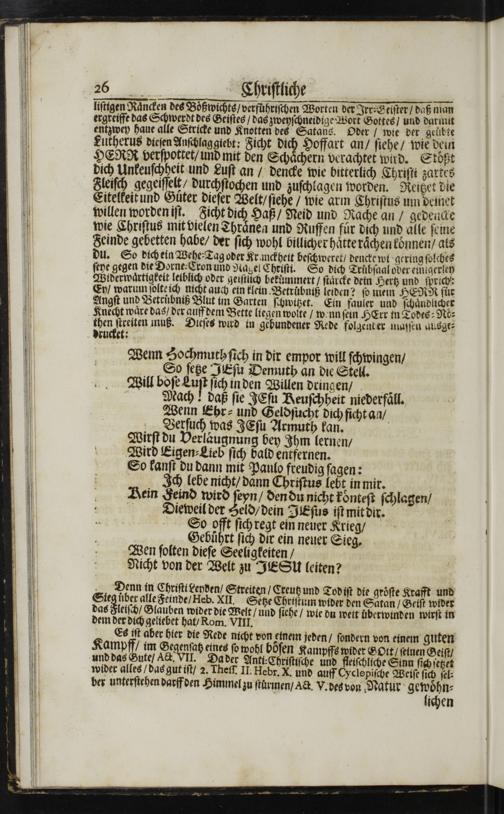 Wenn Zochmuth ſich in dir empor will ſchwingen/ So ſetze JEſu Demuth an die Stell. Will boſe Luſt ſich in den Willen dringen/. Mach! daß ſie IEſu Beuſchheit niederfäll. Wenn Ehr⸗ und Geldſucht dich ficht an/ Verſuch was JEſu Armuth kan. Wirſt du Verlaugnung bey Ihm lernen, Wird Eigen⸗Lieb ſich dald entfernen. So kanſt du dann mit Paulo freudig ſagen: „Ich lebe nicht/ dann Chriſtus lebt in mir. Bein Feind wird ſeyn/ den du nicht konteſt ſchlagen/ Dieweil der Zeld/ dein JlEſus iſt mit dir. So offt ſich regt ein neuer Krieg/ Gebuͤhrt ſich dir ein neuer Sieg⸗ Wen ſolten dieſe Seeligkeiten/ Nicht von der Welt zu JESu leiten?