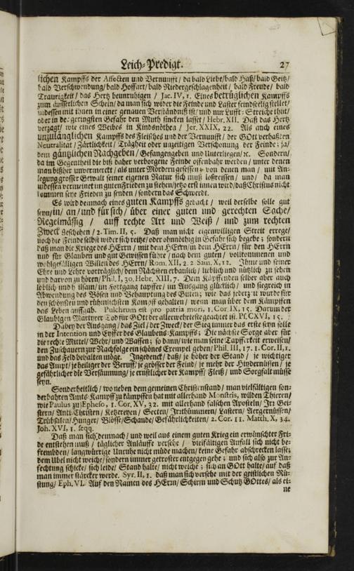 in der Intention und Eyffer des Glaubens⸗Kampffs; Die naͤchſte Sorge aber fuͤr die rechte Mittel/ Wehr/ und Waffen; ſo dann/ wie man ſeine Tapfferkeit erweiſen/ den Zuſchauern zur Nachfolge ein ſchoͤnes Exempel geben/ Phil III, 17. I. Cor. II, 1. und das Feld behalten moͤge. Ingedenck/ daß/ je hoͤher der Stand/ je wichtiger das Ampt/ je heiliger der Beruff/ je groſſer der Feind/ je mehr der Hindernuͤſſen/ je efaͤhrlicher die Verſaͤumung/ je ernſtlicher der Kampff/ Fleiß/ und Sorgfalt muͤſſe