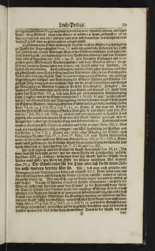 ionen/ unter Mordern und Raͤubern wohnen/ und micht Schaden leiden? Es ge⸗ hort viel darzu ein Daniel unter den Lowen/ ein Joſeph unter den Weibern/ ein Loth in Sodom bleiben. Es iſt vielleichter/ daß ein Boſer zehen Fromme verkehre/ als zehen Frome einen Boͤſen beſſern/ weil das Boͤſe immer eher als das Guteeingehet. Aubey aber auch eine taͤgliche Buß/ wegen der vergangenen Suͤnden/ eine glaubige Ergreiffung der Unſchuld nnd Ausſoͤhnung des Suͤnden⸗Buͤßers und Suͤnden⸗Til⸗ gers zur Vergebung/ und eine ernſtliche Aus zitte der Krafft ſeines Bluts und Geiſtes zur Retutgung von Suͤnden/ folglich ein Fleiß der Gerechtigkeit/ Heiligkeit/ Un⸗ ſchuld und Vollkommenheit/ in der Liebe zum Guten/ und Kampff B. Auffs Blut wider das Boͤſe/ Hebr. XII, 4. daß man nicht zur verdammlichen Entſchuldigung ſeiner Traͤgheit/ welche die Suͤnde verurſachet/l. c. Matth. Xl. und/(welches ſchrock⸗ lich iſt /) der Suͤnden Liebe/zur Verringerung der beyſtehenden Krafft Chriſti gegen der Suͤnden⸗Macht/ de Unmoglichkeit von Suͤnden laſſen zu koͤnnẽ vorſchutz wider Rom. VI, 12. 14. I. Jch. III, 9. Gal. V, 15. 17. Dann/ ſo viel man der Suͤnde/ auch der Herrſchafft einer einigen Suͤnden Platz gibt/ ſo viel raͤumt man dem Sa⸗ tan ein/ 1. Joh. III, 8. Joh. VIII, 44. ob einer nun von einem gantzen Hauffen Feind zugleich/ oder von einem eintzelen Soldaten oder Stall⸗Buden gefangen oder er⸗ ſclagen wird und mh iſt doch der Sieg und Leben verlohren. Darummuß man trachten abzulegen alle Sunde/ ſo anklebet/ und traͤge machet/ Hebr. XII, r. Man muß nickt nachlaͤſſig ſeyn/ ſich zu retnigen/ von aller Befleckung des Fleiſches und des Geiſtes/ 2. Cor. VII, 1. Damit ma nicht/ ohne Ablegung der Sunde/ nach dem vorigen Wandel/ Eph. IV, 1. Petr. IV. Hebr. XII. voin Boſen uͤberwunden werde/ ſo dern ůber winde das Boͤſe mit Gutem/ Rom. XII, 21. Sy r. XXI, 2. Sinte⸗ mahl wohl zu beſorgen/ die Gottliche Snad/ die ein ſolcher ſolang verſchmaͤhet hat/ werde ſchwerlich o5 ihm ſchweben/ Syr. V. XVIII. und Luc. XII.