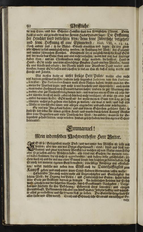 Mit dieſſen hielte es unſer ſeelige Herr Palm/ wollte aber nicht viel darvon geruͤhmet wiſſen/ ſondern lieſſe folgendes judicium von den Perſona- „lienüͤber: Die Perſonalien konten wohl ihren Nutzen haben/ wann man der Ge⸗ „meine die Warheit ſagte/ und nicht ſo viel heuchelte und ſchmeichelte/ auch wenn „man weder Hochmuth noch Demuth darinn ſuchte/ ſondern ſie zur Warnung ent⸗ „weder/ oder zur Nacheyfferung dienen lieſe; mit was vor einem Sinn ich jetzo die⸗ „ſes ſchreibe/ weiß ich wohl; aber ich bin doch nicht verſichert/ ob nicht ein oder das „ander darunter ſtecket/ GOtt weiß es/ der wolle meinen Sinn von Tag zu Tag „laͤutern/ nichts zu begehren oder haben zu wollen/ als was er will/ und daß ſein „Wille/ er ſeye ſuß oder ſauer/ mir allezeit angenehm/ und anbetens wuͤrdig ſeye.