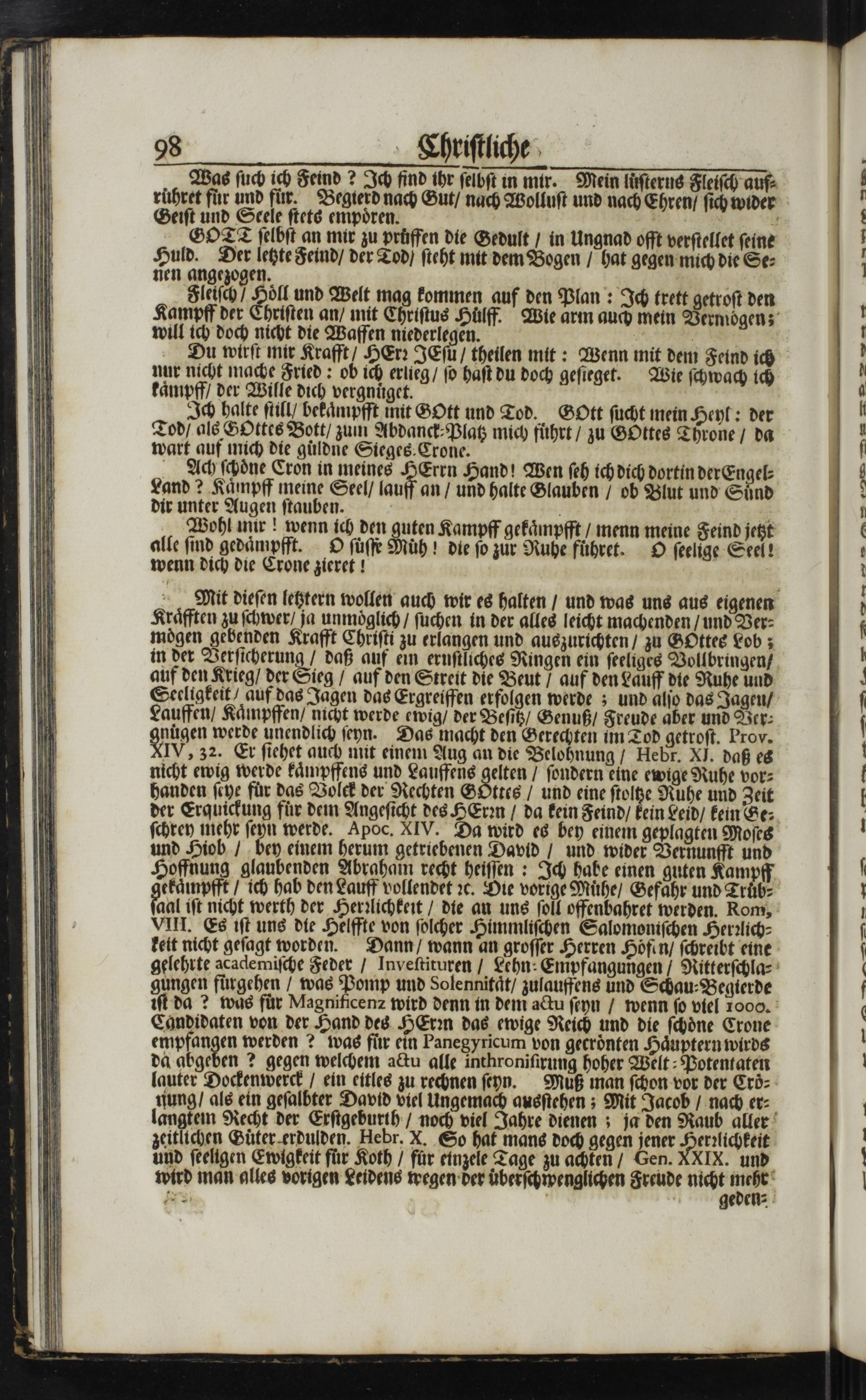 Kraͤfften zu ſchwer/ ja unmoͤglich/ ſuchen in der alles leicht machenden/ und Ver⸗ moͤgen gebenden Krafft Chriſti zu erlangen und auezurichten/ zu GOttes Lob; in der Verſicherung/ daß auf ein ernſtliches Ringen ein ſeeliges Vollbringen/ auf den Krieg/ der Sieg/ auf den Streit die Beut/ auf den Lauff die Ruhe und Seeligkeit/ auf das Jagen das Ergreiffen erfolgen werde; und alſo das Jageu/ Lauffen/ Kaͤmpffen/ nicht werde ewig/ der Beſitz/ Genuß/ Freude aber und Ver⸗ Wügen werde unendlich ſeyn. Das macht den Gerechten im Tod getroſt. Prov.